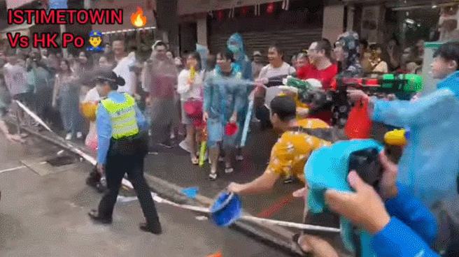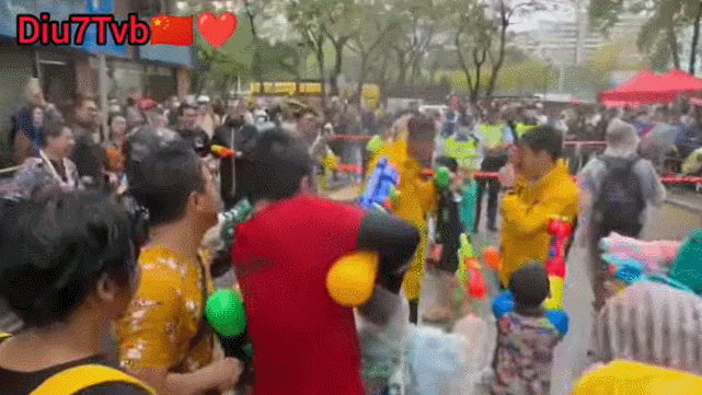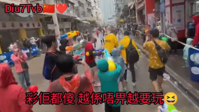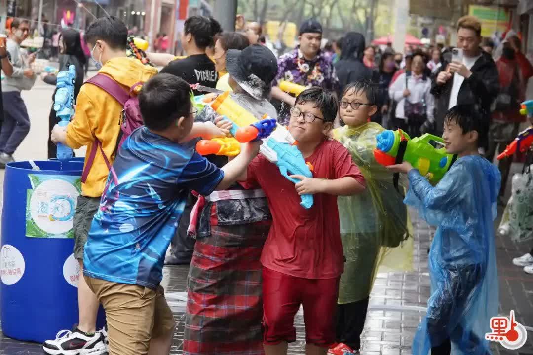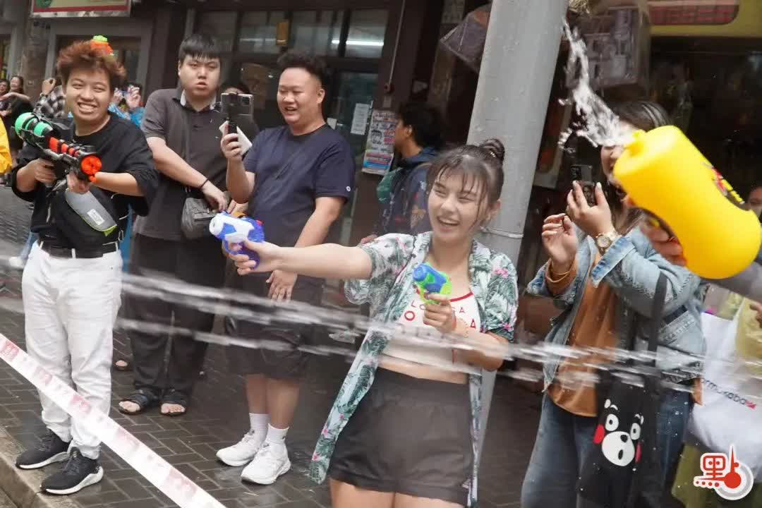 好多本地泰國人及香港市民,在泰國店舖林立的九龍城拿着水槍四處噴水玩個不亦樂乎。