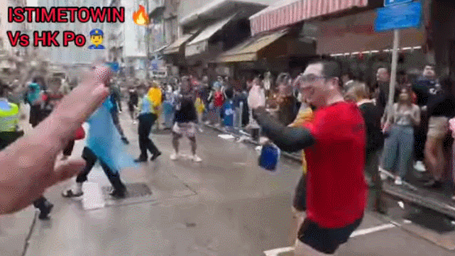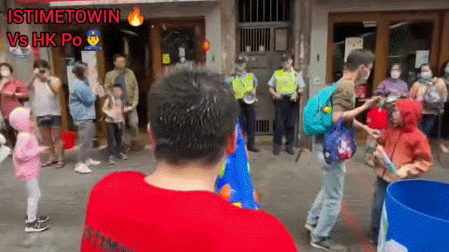 影片所見,幾個男人領着一群小孩,拿着大小水槍,追着執勤中維持秩序的警員。