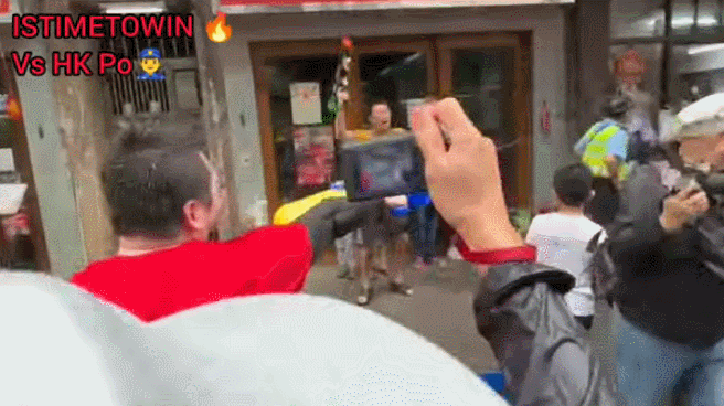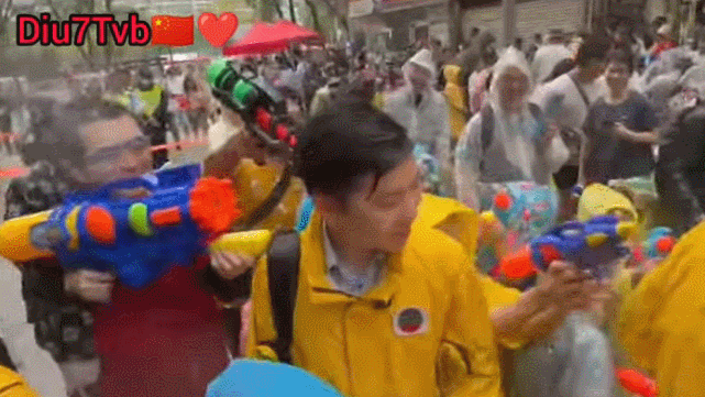 他們又向TVB記者及攝影師貼面噴水,還把水槍朝記者衣領、背包內射,更追着他們的攝影器材、咪高峰等工具猛噴水。