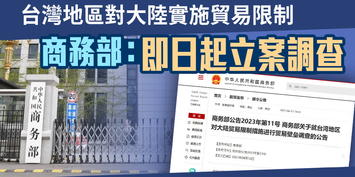 自本公告發布之日起,商務部就台灣地區對大陸貿易限制措施進行貿易壁壘調查。