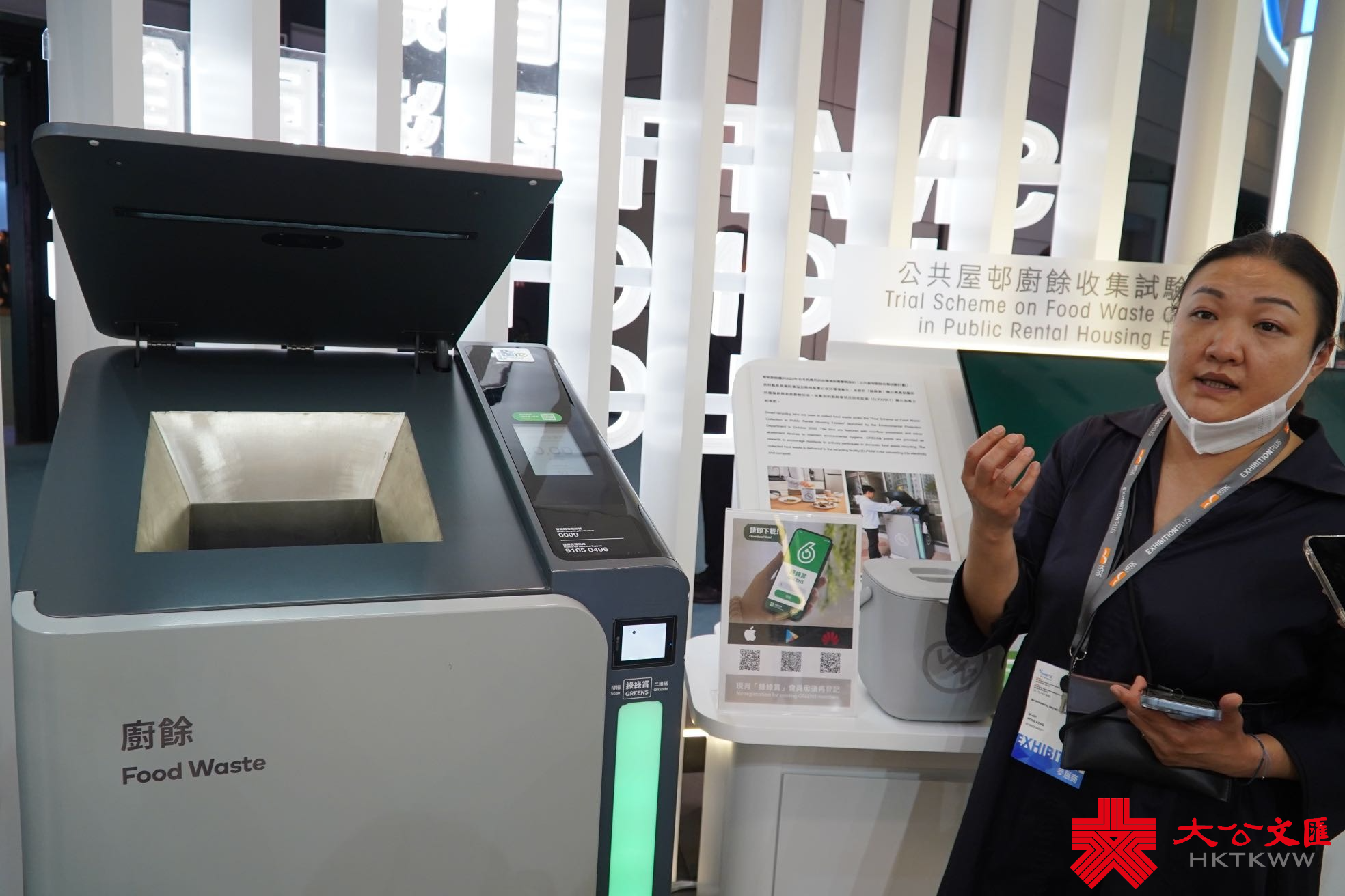 開展首日,灣仔會展中心人頭湧湧,在位於三樓的「香港國際創科展」,焦點展館之一是由政府資訊科技總監辦公室設立的「智慧香港展館」。在這裏,大公文匯全媒體記者留意到一個比較「特別的垃圾桶」。據負責人介紹,「智能廚餘機」於2022年10月起應用於由環境保護署開展的「公共屋邨廚餘收集試驗計劃」,特點是具備防滿溢及除味裝置,以保持環境衞生,並提供綠綠賞積分獎賞,鼓勵居民積極參與家居廚餘回收,收集到的廚餘會送往回收設施(O.PARK1)轉化為電力和堆肥。