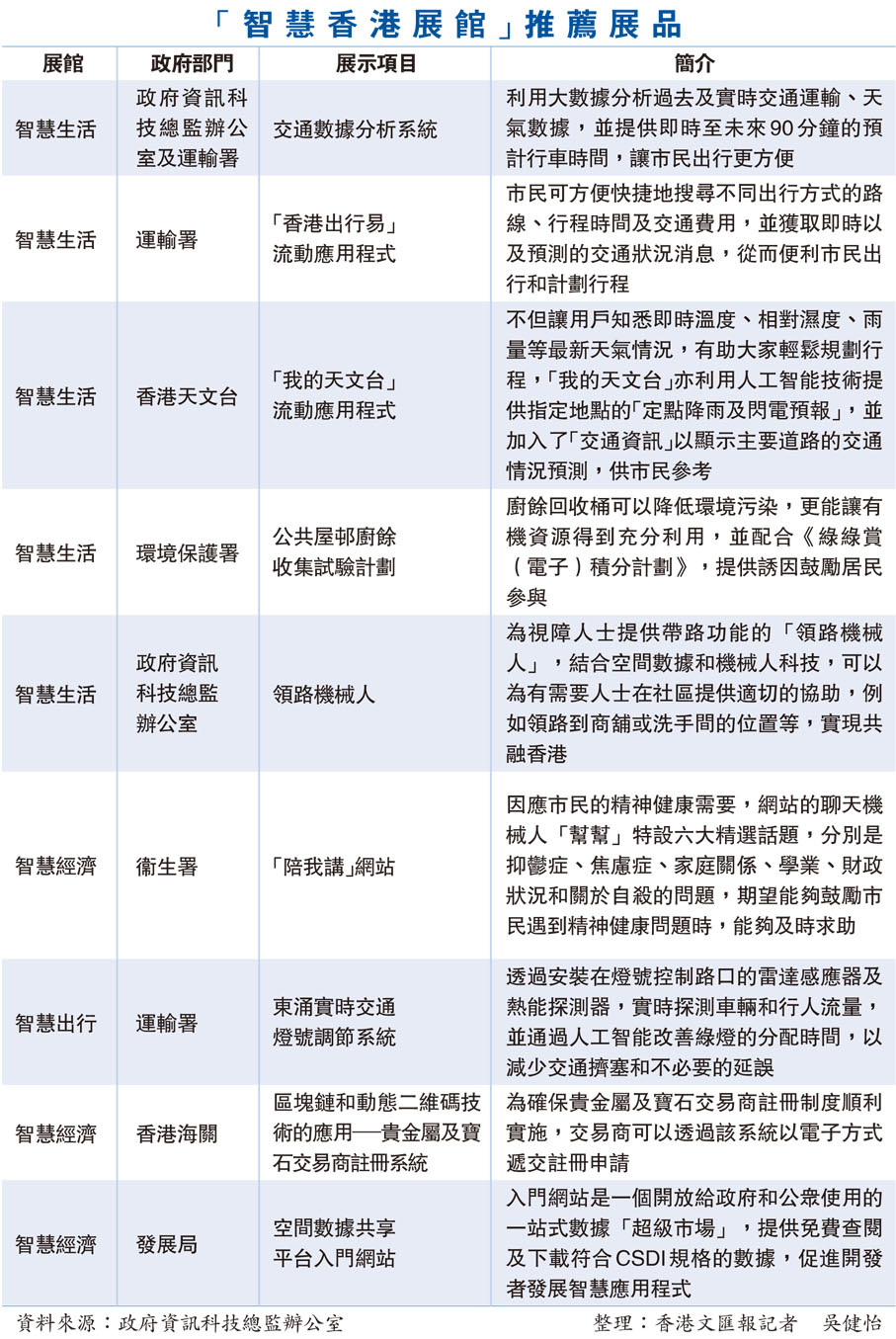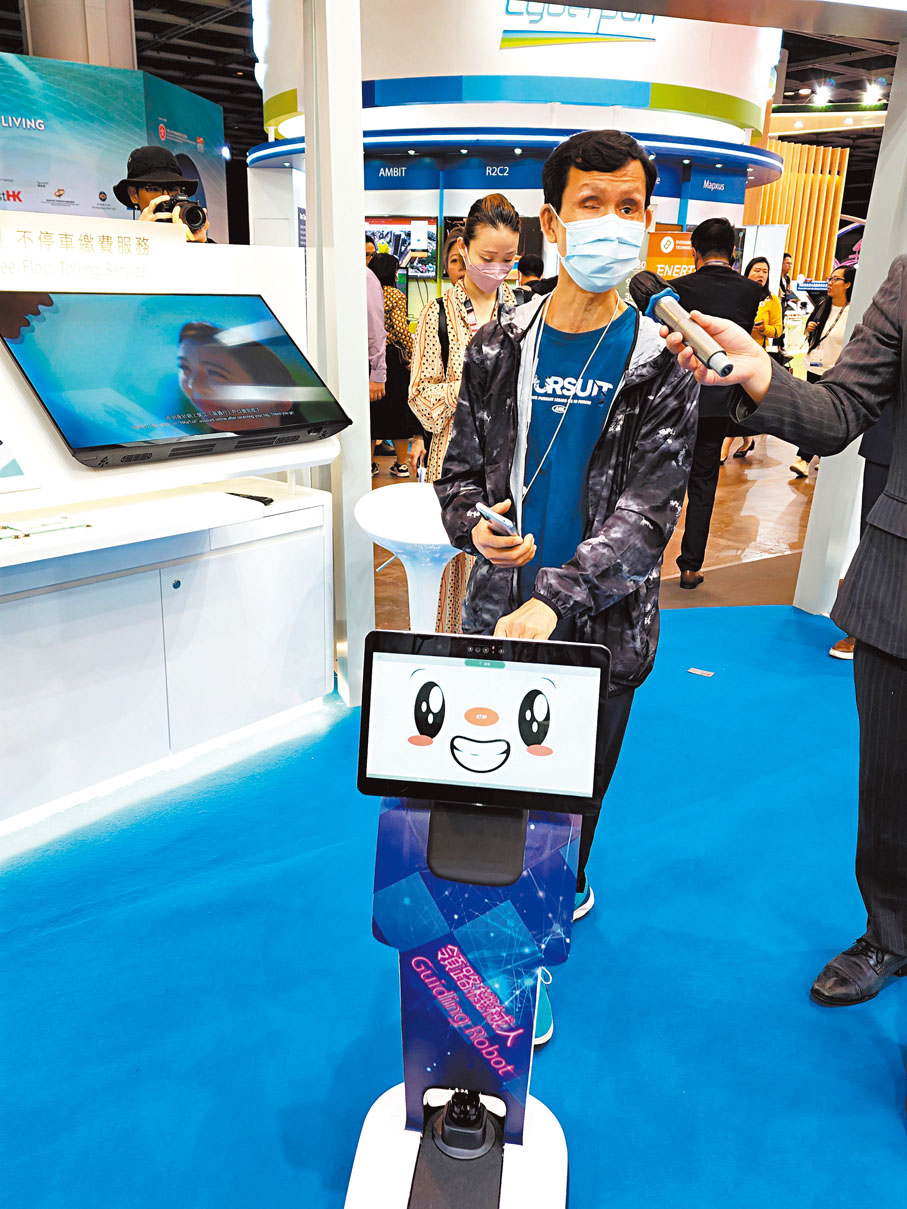 (香港文匯報 記者 吳健怡)香港銳意打造為智慧城市,特區政府亦透過科技提升施政效率,以及便利市民的生活。特區政府資訊科技總監辦公室昨日起,在「香港國際創科展」設置「智慧香港展館」,展示政府逾百項創新成果,如何令市民的生活更便捷、舒適,其中一台像直立式吸塵機大小的「領路機械人」首次亮相,它是視障人士的「良伴」,有它在左右,視障人士出門不再怕碰壁或迷路。衞生署使用AI技術引入「聊天機械人」,以辨識來電者有否自殺傾向或情緒問題,及時提供支援。這些科技令政府的服務充滿溫度。