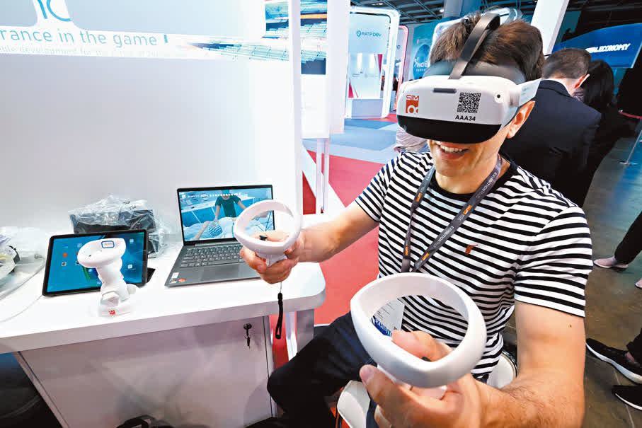 參展者之一、來自法國的Alexis Huille是珠海虎江科技聯合創辦人及首席執行官。他介紹,公司致力為零售、娛樂、社交等應用場景帶來沉浸式虛擬現實服務,向醫療、工業、文旅、體育等行業提供定制化XR(延展實境)解決方案,包括研發了虛擬實境急救培訓系統,以及用於培訓醫護人員的「虛擬病房」,有關系統在香港的大學亦有採用,「學員們可透過VR裝置進行實時操作,只要用上一兩次就可記住(醫護)步驟,比起觀看影片高效得多。」
