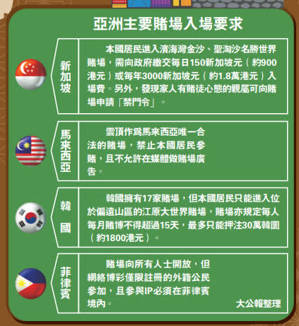 目前,亞洲共有7個國家及地區設有賭場,包括中國澳門、馬來西亞、新加坡、韓國、菲律賓、柬埔寨以及越南。大阪有望成為第8個設有賭場的地區。大阪賭場的提案,由美國博彩巨頭米高梅與日本歐力士公司合作推進。不過,仍需等待獲發博彩牌照才能開展業務。
