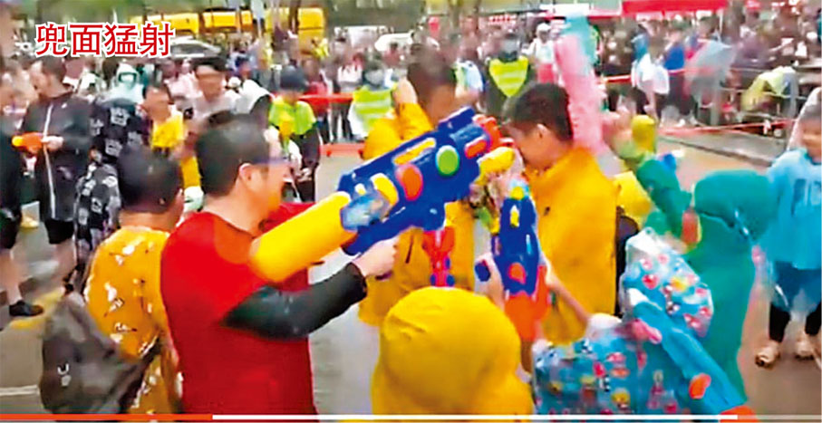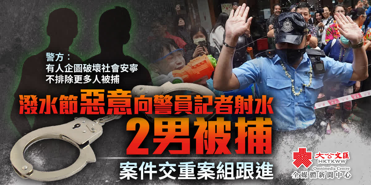 (香港文匯報 記者 蕭景源)受疫情影響停辦3年的「九龍城潑水節」於本周日(9日)復辦,吸引大批男女老幼和中外人士參加,互相射水普天同慶,詎料有懷疑為黑暴餘孽者趁機混在人群中搞事。當日,有片段拍攝到一名紅衫男子聯同另外4人涉嫌針對性專以警員及無綫電視記者作目標,故意射水施襲,企圖藉節日為名凌辱警員和記者。九龍城警區人員經調查後,於昨日以涉嫌「在公眾地方擾亂秩序」罪名共拘捕兩名25歲及26歲的男子,包括該名紅衫男。案件目前仍在調查,不排除有更多人被捕。