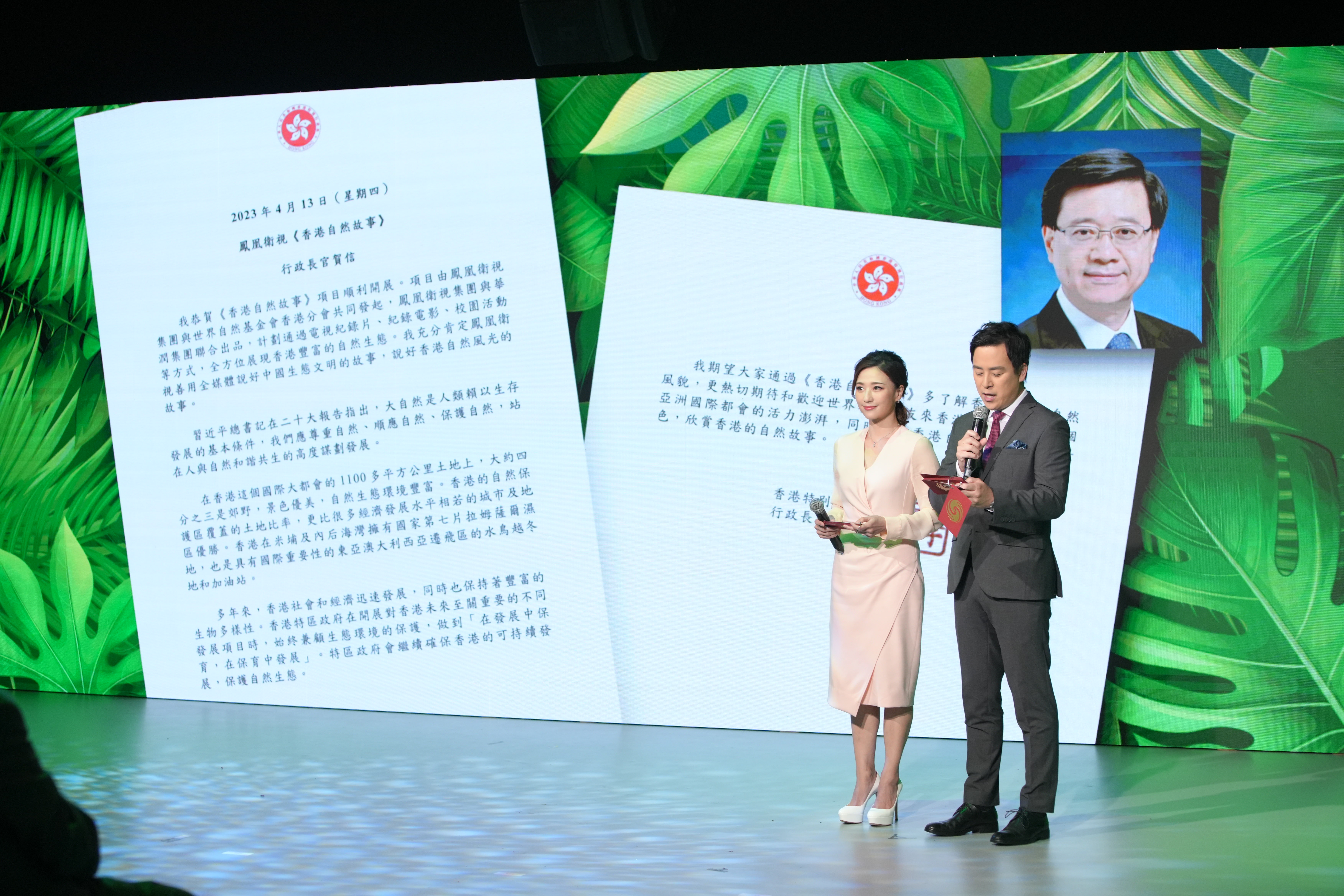 啟動儀式現場,行政長官李家超發來賀信,恭賀《香港自然故事》項目順利開展。李家超指出,計劃通過電視紀錄片、紀錄電影、校園活動等方式,全方位展現香港豐富的自然生態。他強調,多年來,香港社會和經濟迅速發展,同時也保持着豐富的生物多樣性。特區政府在開展對香港未來至關重要的不同發展項目時,始終兼顧生態環境的保護,做到「在發展中保育,在保育中發展」。特區政府會繼續確保香港的可持續發展,保護自然生態,並期待通過《香港自然故事》,能夠令人們更了解香港不同的自然風貌,更熱切期待和歡迎世界各地朋友來香港,親自感受這個亞洲國際都會的活力澎湃,享受香港自然生態的怡人景色,欣賞香港的自然故事。