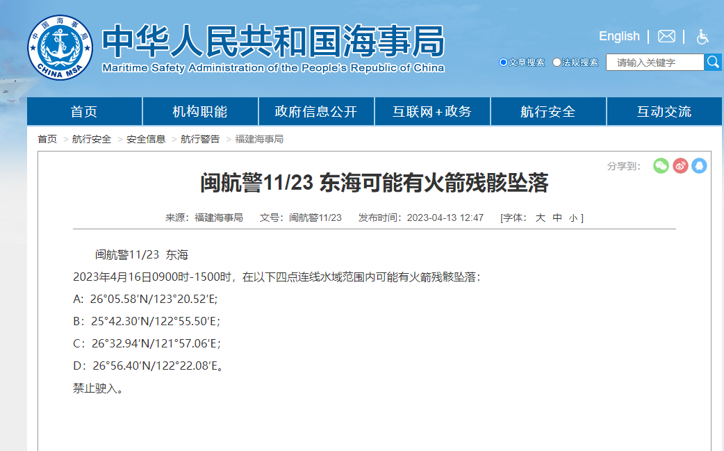 不過,打臉來得很快,福建海事局13日下午發布航行警告稱,4月16日9時至15時,在東海四點連線水域範圍內(見上圖)可能有火箭殘骸墜落,禁止船隻駛入。