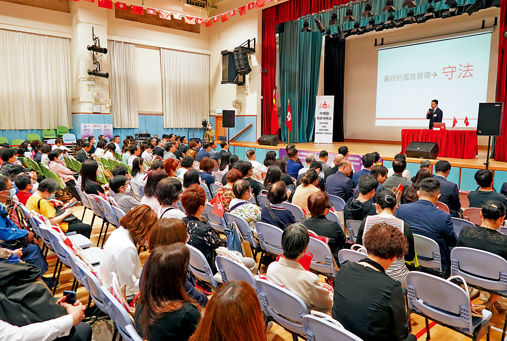 中西區民政事務處昨日下午於西營盤社區綜合大樓禮堂舉辦「喜迎香港特區成立26周年─中西區全民國家安全教育日研討會」,邀請嚴康焯大律師(小圖)為主講嘉賓,向市民講解香港國安法相關條例與部分涉及香港國安法的案例。