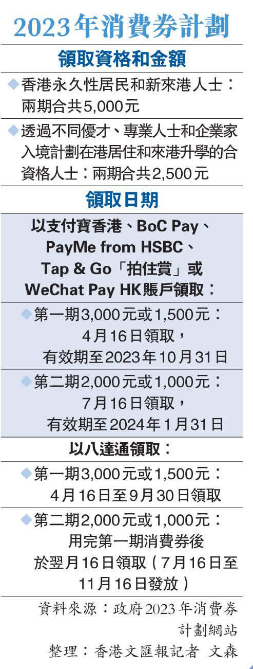至於透過其他支付工具領取消費券的市民,將劃一於4月16日及7月16日收到兩期消費券,使用有效期分別為10月31日及明年1月31日。