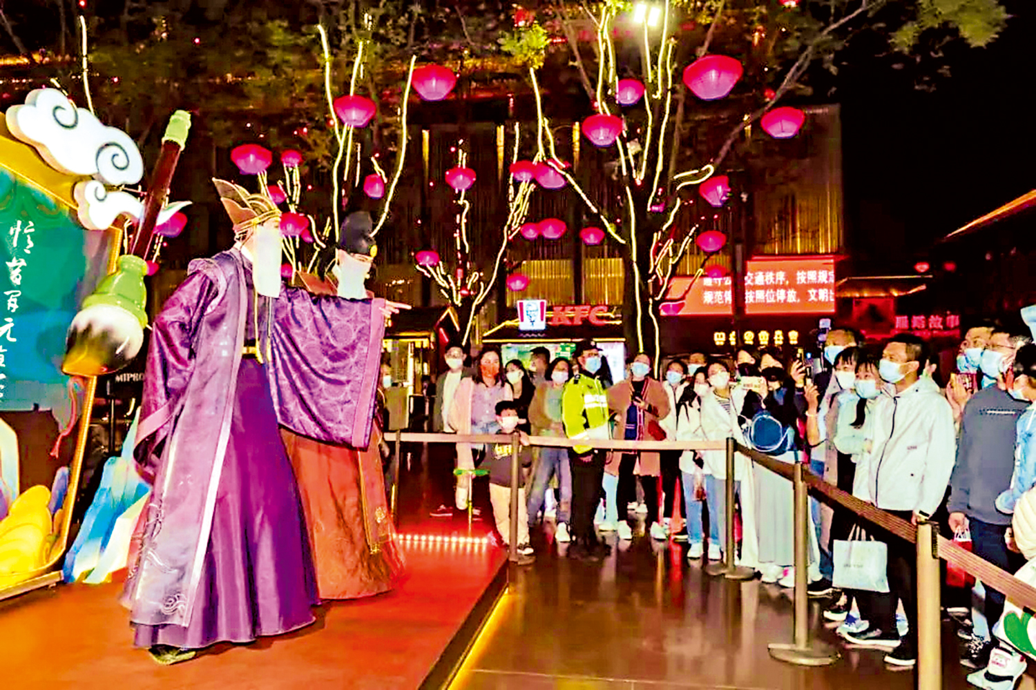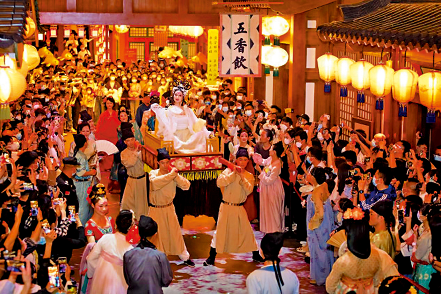 「在西安,前一秒還在沉浸式體驗盛唐氣魄,後一秒又無縫對接到現代的時尚感,古今的碰撞和反覆切換,讓人流連忘返。」遊客李婉兒感嘆。她一早便趕到西安大唐不夜城。「這裏的白天便已入唐。裊裊唐音中,唐風飄逸的襦裙麗人和翩翩少年往來穿梭,相視一笑,讓人心醉。」到了晚上,漫步在唐文化街區中,更是猶如穿越。「一不小心就會『偶遇』李白,剛剛還在跟着不倒翁姐姐起舞,瞬間又被巡演的花魁所吸引,還有房玄齡和杜如晦兩位名相的盛情相邀。」