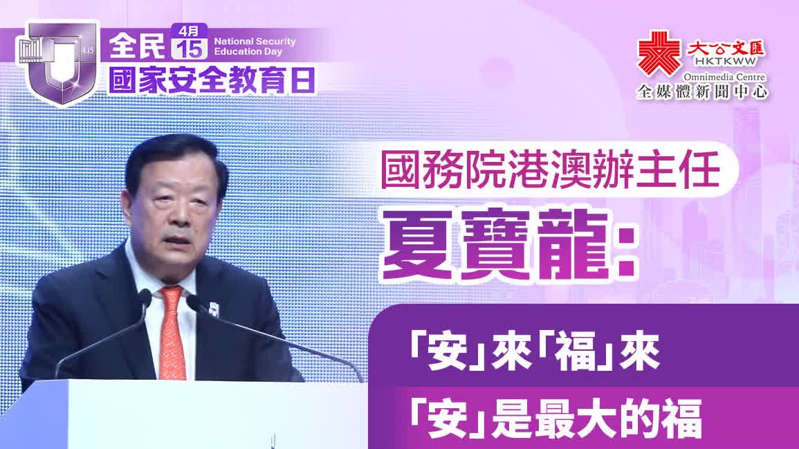 香港特別行政區維護國家安全委員會主辦的「全民國家安全教育日2023」開幕典禮15日在香港舉行,國務院港澳事務辦公室主任夏寶龍出席開幕典禮並致辭。