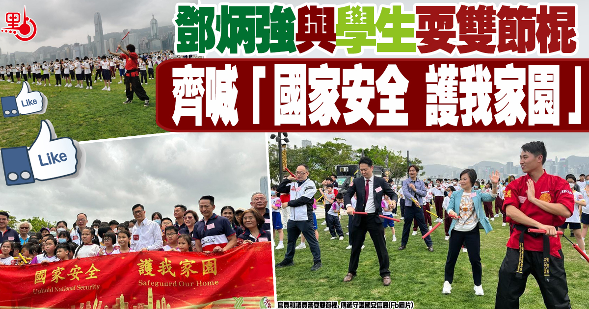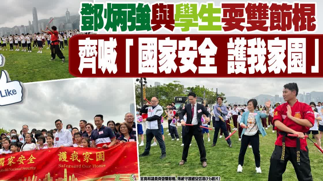 鄧炳強在活動上帶領學生高呼「國家安全,護我家園」。他在社交平台發帖表示,現場見到參與活動的小朋友認真努力耍海綿雙節棍,「真係說不出的可愛。」