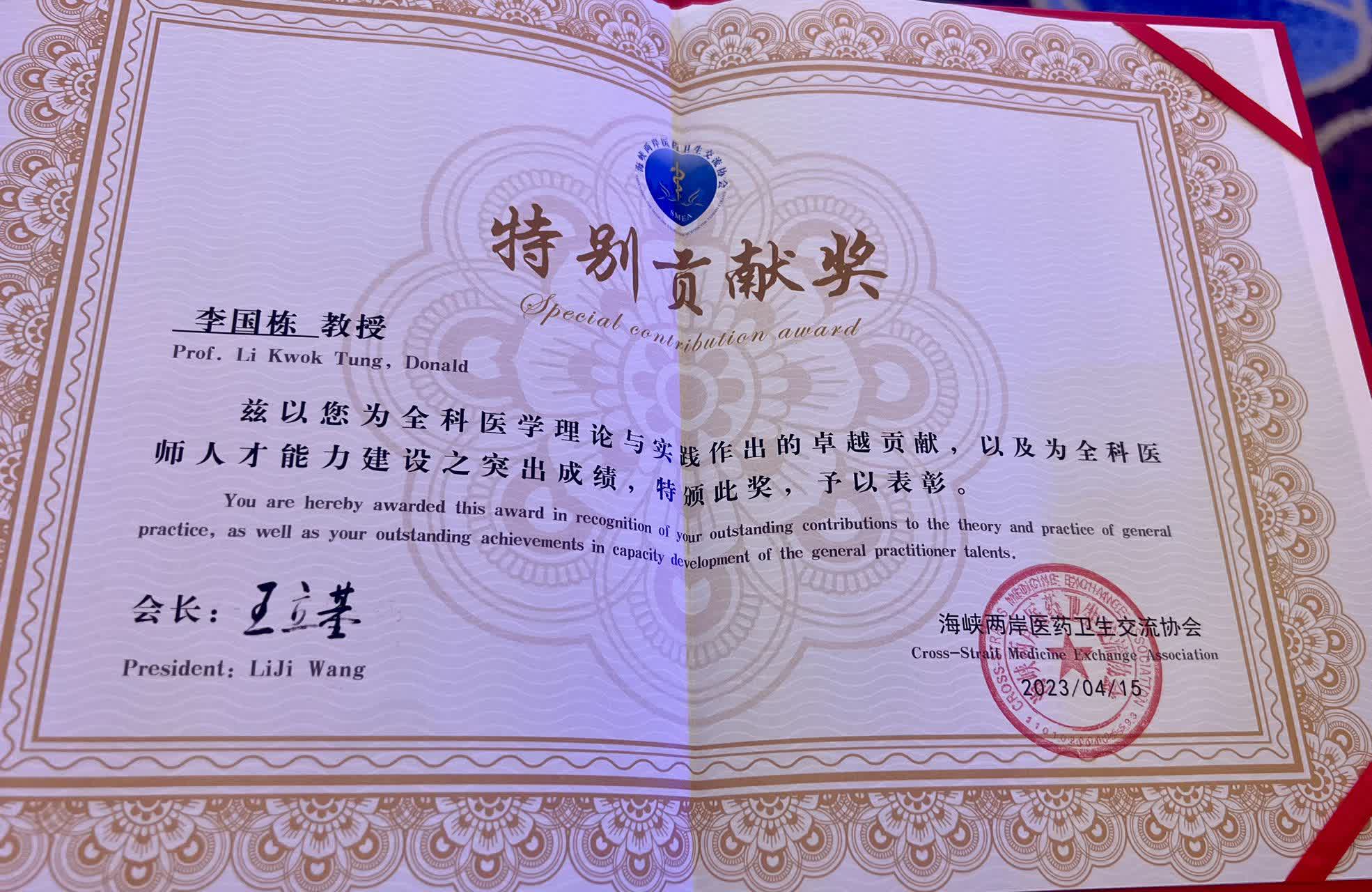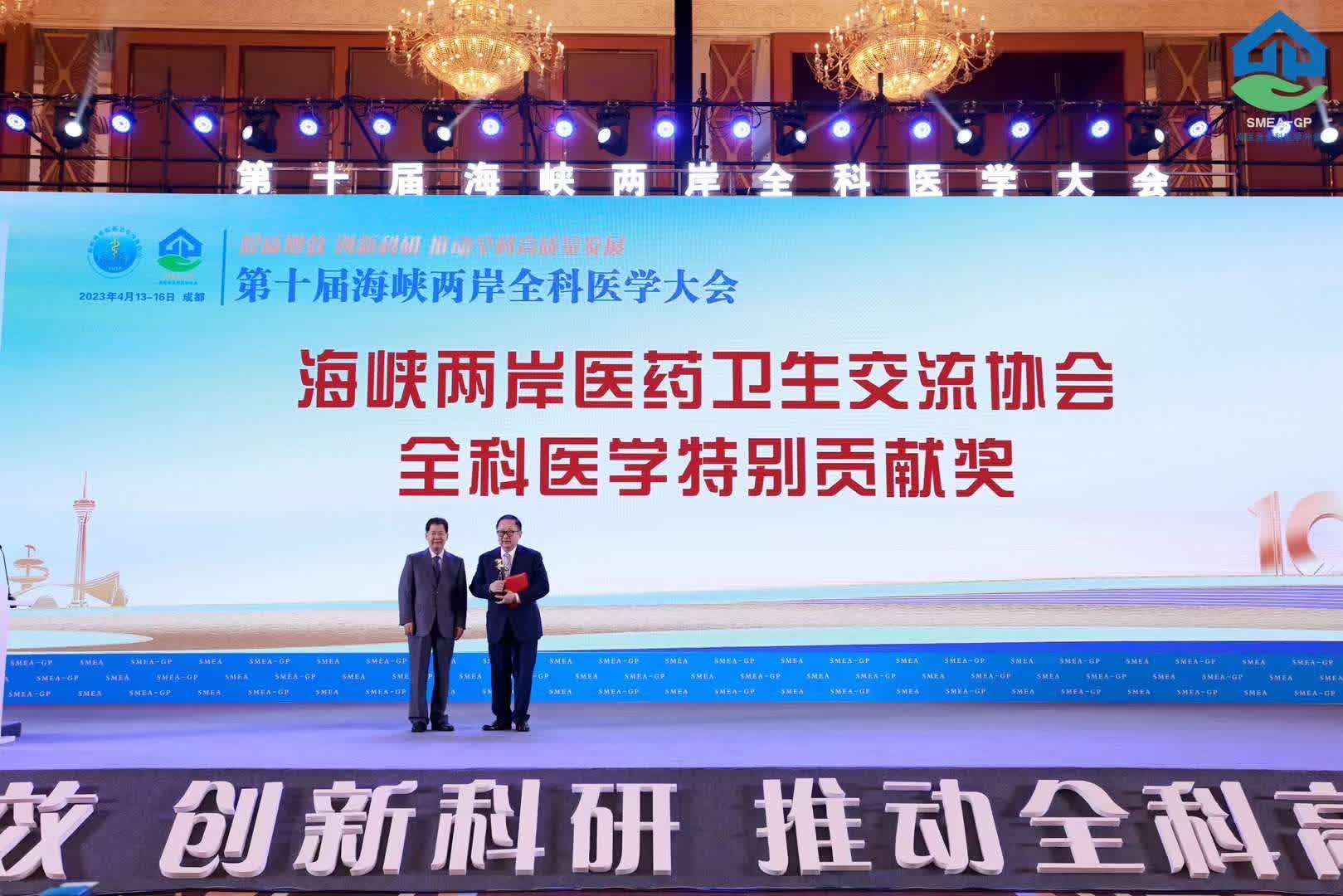 大公文匯網報道,第十屆海峽兩岸全科醫學大會4月13-16日於成都舉行。今日(15日),海峽兩岸醫藥衞生交流協會在年會開幕式上以海峽兩岸醫藥衞生交流協會的名義,由總會王立基會長、分會祝墡珠教授共同向李國棟教授頒發海峽兩岸醫藥衞生交流協會全科醫學特別貢獻獎,以此感謝李國棟教授多年來為海峽兩岸暨香港、澳門地區全科醫學發展做出的貢獻。