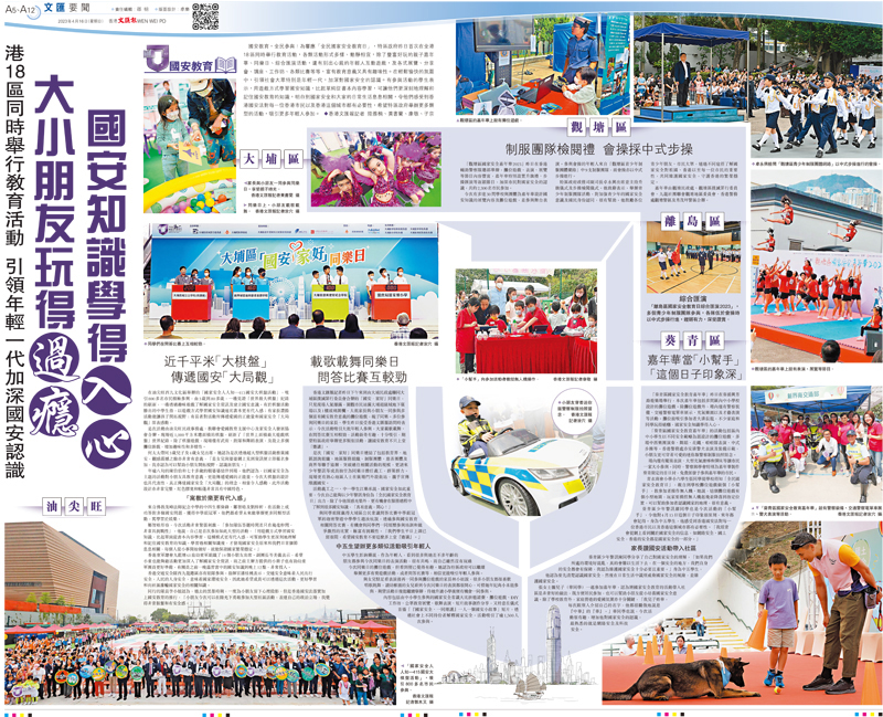 (香港文匯報 記者 陸雅楠、黃書蘭、康敬、子京)國安教育,全民參與!為響應「全民國家安全教育日」,特區政府昨日首次在全港18區同時舉行教育活動,各類活動形式多樣、動靜相宜,除了豐富好玩的親子嘉年華、同樂日、綜合匯演活動,還有別出心裁的年輕人互動遊戲,及各式展覽、分享會、講座、工作坊、各類比賽等等,富有教育意義又具有趣味性。在輕鬆愉快的氛圍中,引領社會大眾特別是年輕一代,加深對國家安全的認識。有參與活動的學生表示,用遊戲方式學習國安知識,比起單純從書本內容學習,可讓他們更深刻地理解和記住國安教育的知識,明白到國家安全和大家的日常生活息息相關,令他們感受到香港國安法對每一位香港市民以及香港這個城市都有必要性,希望特區政府舉辦更多類型的活動,吸引更多年輕人參加。