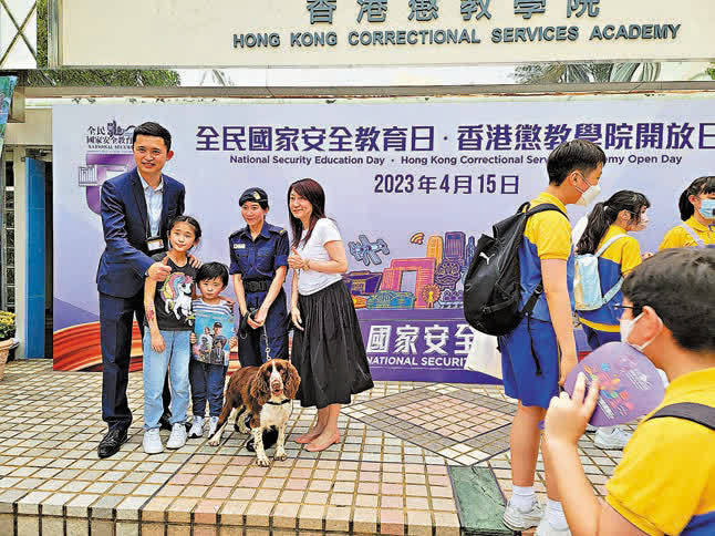 懲教署在赤柱香港懲教學院舉行開放日,加深市民對國家安全和懲教署工作的認識。昨日下午,開放日現場人頭湧湧,不同遊戲攤位前排起長龍,有中小學組織學生集體參觀。有家長積極報名,希望讓小朋友了解不同紀律部隊的工作範疇,學習國安知識。