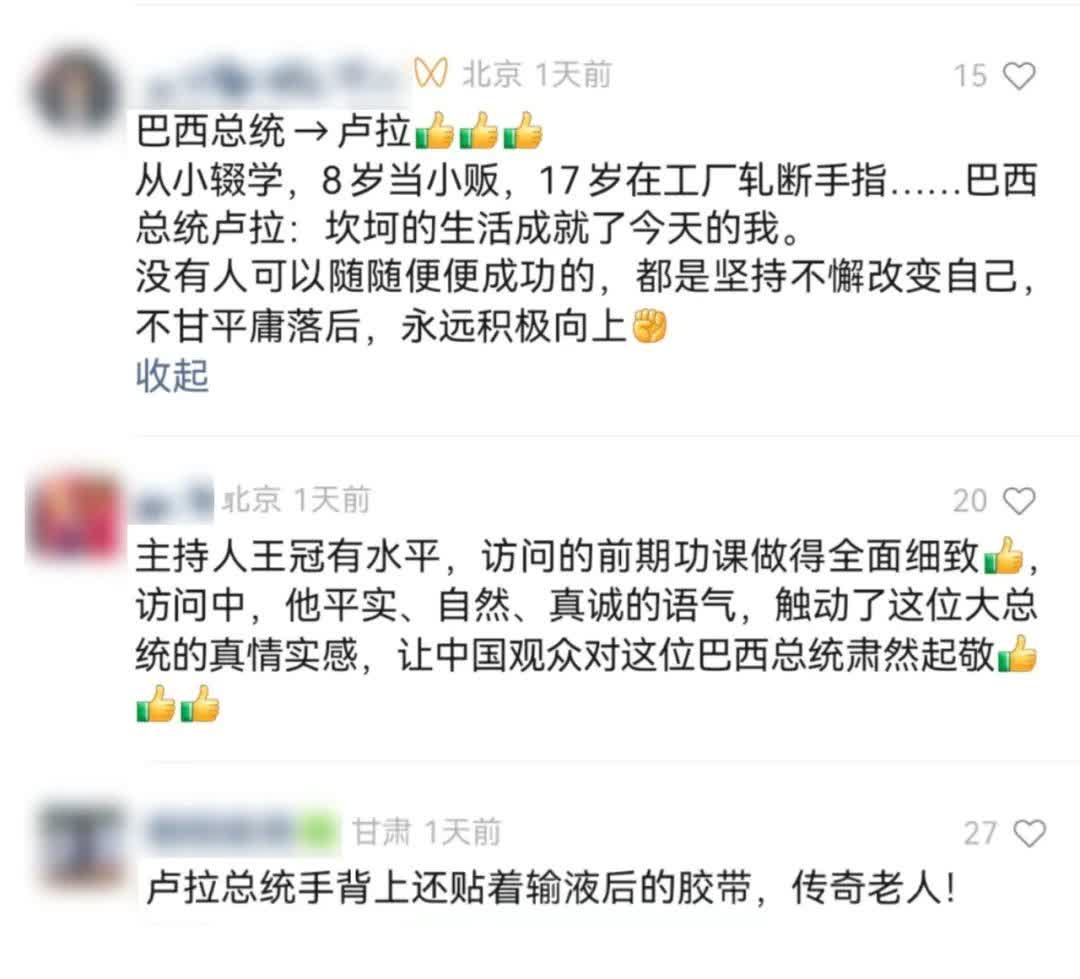 總台《高端訪談》專訪巴西總統盧拉的節目獲全網置頂推薦,全媒體累計觸達5162萬人次,#總台專訪巴西總統#登上新浪微博要聞話題榜。本期節目相關評論分析文章也獲得多家主流媒體全文轉發。目前,《高端訪談》相關微博話題的總閱讀量過億。