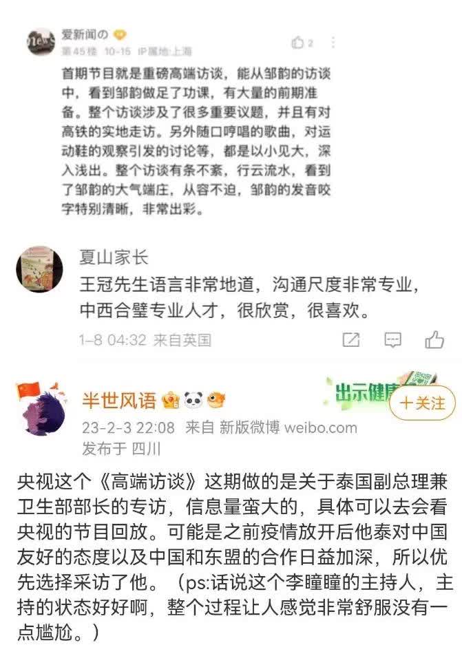 人之相識,貴在相知;人之相知,貴在知心。「知心」是交流對話、建立友誼的最高境界,對於人物訪談來說更是如此。鄒韻、王冠、李曈曈三位總台主持人的採訪邏輯嚴密、自信從容、靈動活潑,善於從直擊人心的關鍵點發問,控場張弛有度,彰顯《高端訪談》的國際視野和中國風範,獲得海內外廣泛關注。