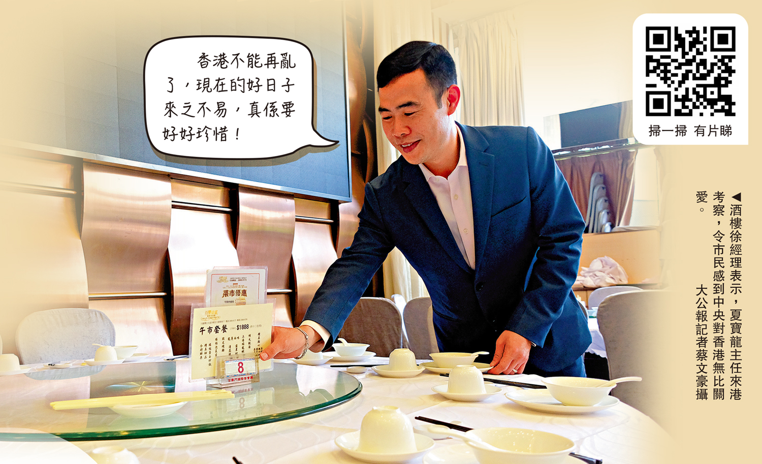 挺過黑暴衝擊、熬過疫情三年,Danny說,酒樓已經恢復至疫情前約八成生意,「香港發展離不開祖國的幫助」。他認為,夏寶龍主任來港令人感到國家對香港的厚愛,而隨着社會逐步復常,相信香港很快會回復以往的魅力!