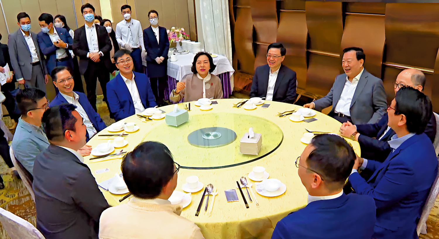 夏寶龍主任來港第二天(4月14日)與地區人士一起喝早茶,了解地區情況,並就地區議題作深入交流。與夏主任一起飲茶的九龍東立法會議員鄧家彪透露,夏主任與他們交談時「聽得多講得少」,聽取了地區工作的辛酸、疫情下做出的貢獻等,肯定了他們作為愛國者發揮的積極作用,並講了不少鼓勵的說話。