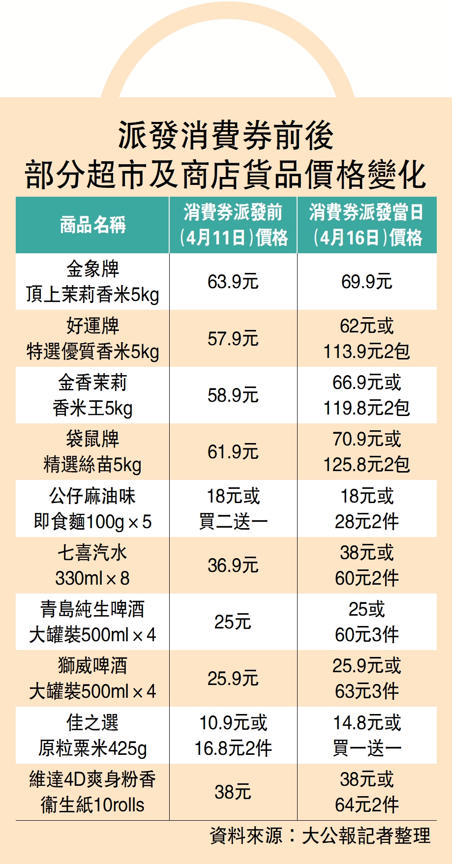 記者在消費券推出前,曾記錄連鎖超市多項食品價格,發現部分商品在消費券派發後加價,以5公斤袋裝大米為例,四種熱門品牌的價格上升4元至9元不等,有三個品牌額外推出買兩袋特價優惠,但算出的每件平均單價仍比消費券派發前的單件價格貴。