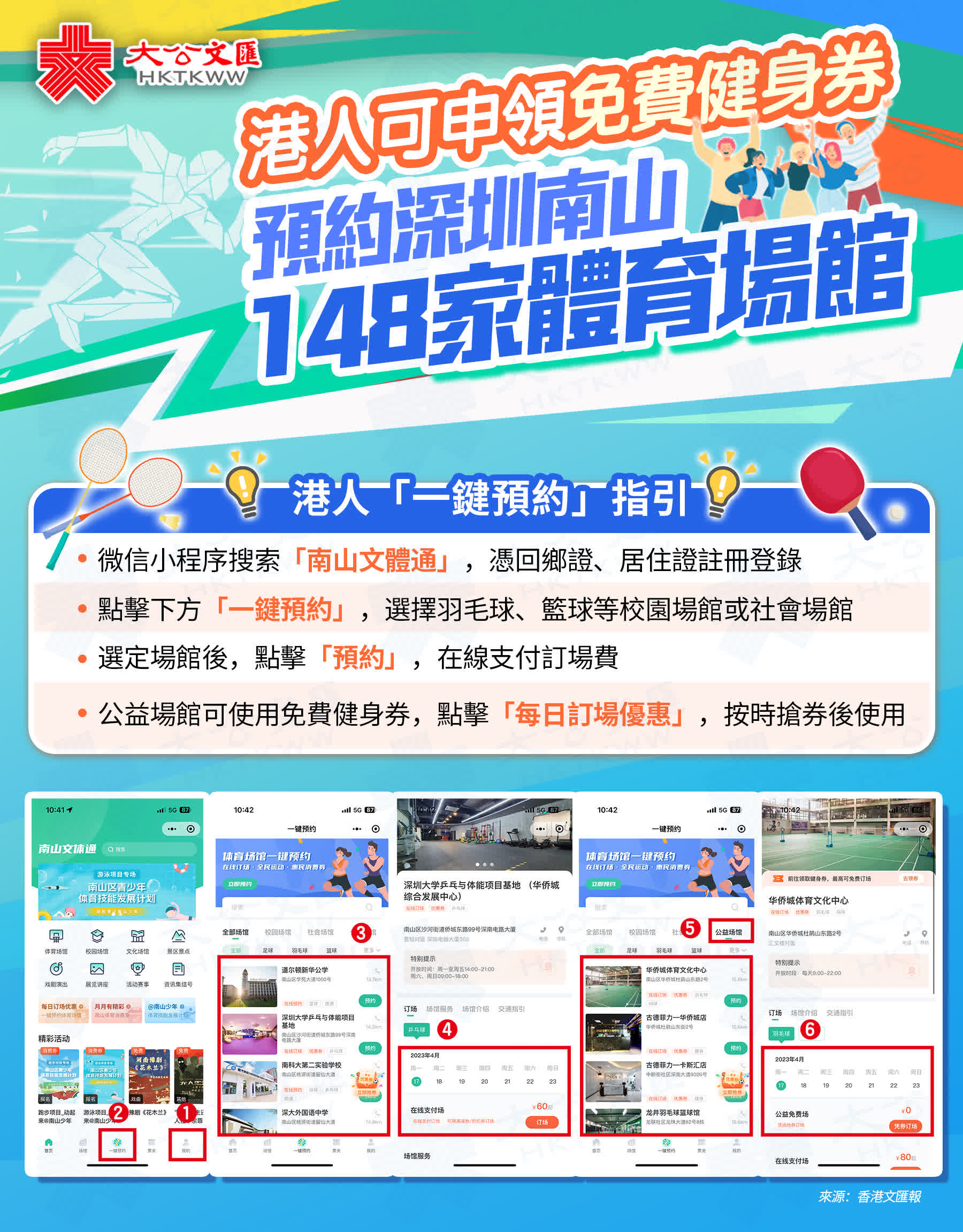 (香港文匯報記者 郭若溪 深圳報道)港人在深圳體育健身也能享免費訂場優惠了,可與內地居民同等待遇。近日,深圳市南山區啟動了2023南山體育消費季活動,通過發放免費體育消費券,策劃水上運動、冰雪運動等10餘個特色專項活動,推進全民健身運動。為進一步促進深港融合,活動首次設置香港專項,港人可跨越深圳灣,通過「一鍵預約」平台來參與南山公益文化體育活動,在線可預約的體育場館達148家。同時,港人還可參與文化演出免費搶票和補貼購票等活動,進一步豐富業餘文化生活。香港文匯報記者了解到,前兩屆體育消費季活動因疫情等並未開放給港人參與,此次是首次向在深居住港人及在港居住的香港市民開放。