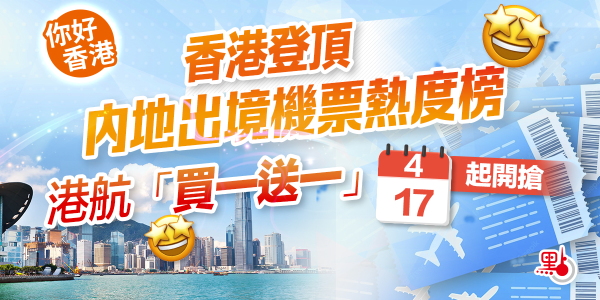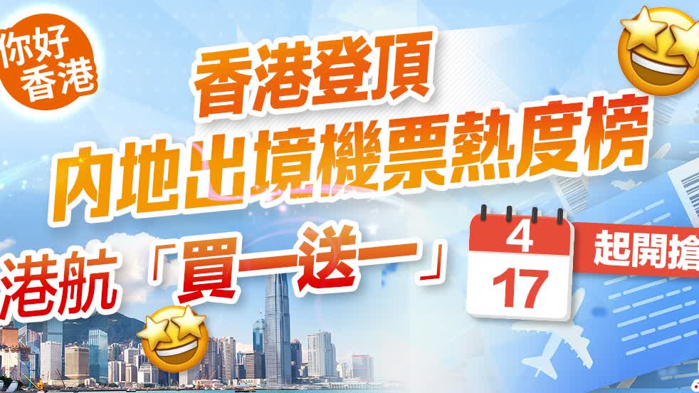 大公文匯全媒體報道,內地「五一」黃金周臨近,不少民眾開始計劃旅行,境內航班搜索熱度已超過2019年150%,跨境航班搜索熱度較2019年同期增近40%。當中,香港是出境機票熱度Top 1目的地。香港航空今日(17日)起在攜程平台推出「買一送一」活動,旅客以單人機票的價格,即可享受雙人機票福利。