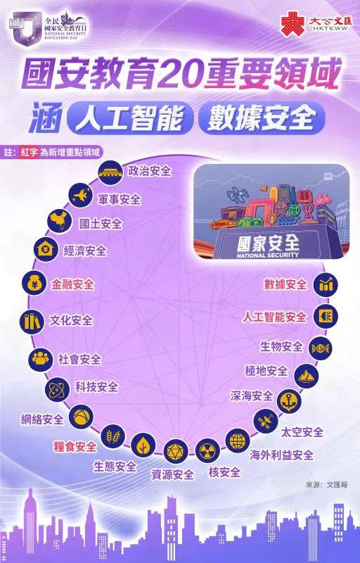 (香港文匯報 記者 陸雅楠)隨着國家及國際社會形勢不斷發展,為讓香港市民更具體了解國家安全所涉的方方面面,國安教育的涵蓋內容亦持續更新。香港特區政府「全民國家安全教育日」網頁最新資料顯示,國家安全的重點領域近日進行了更新,由原有的16個增至20個。新增的4個重點領域分別為人工智能安全、數據安全、金融安全和糧食安全。其中,人工智能安全、數據安全均羅列出相關領域發展的挑戰與機遇,包括人工智能具備模仿人類解決問題的巨大潛力,亦面臨遭受惡意應用、私隱數據洩露、取代工人職位等潛在風險。最近引起全球熱議的智能聊天機械人ChatGPT,亦有作為例子於今次更新中提及。教育界人士認為,是次更新與時並進,有助學生及早裝備自己,應對社會未來挑戰。