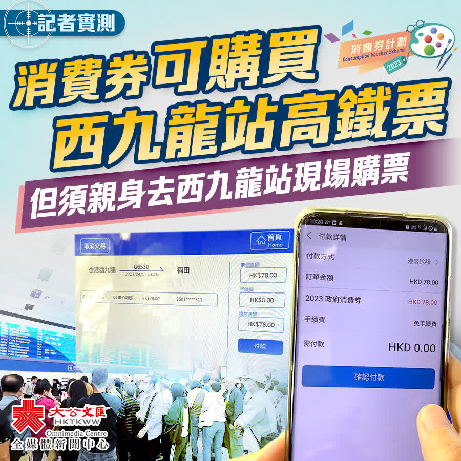 大公文匯全媒體記者今日(17日)實測發現,消費券除了可以在Klook平台購買境外旅遊景點門票及預定酒店房間之外,還可以購買前往內地的高鐵票。不過,想要使用政府消費券購買高鐵票,只能前往香港西九龍站現場購票,包括用自助購票機購票。