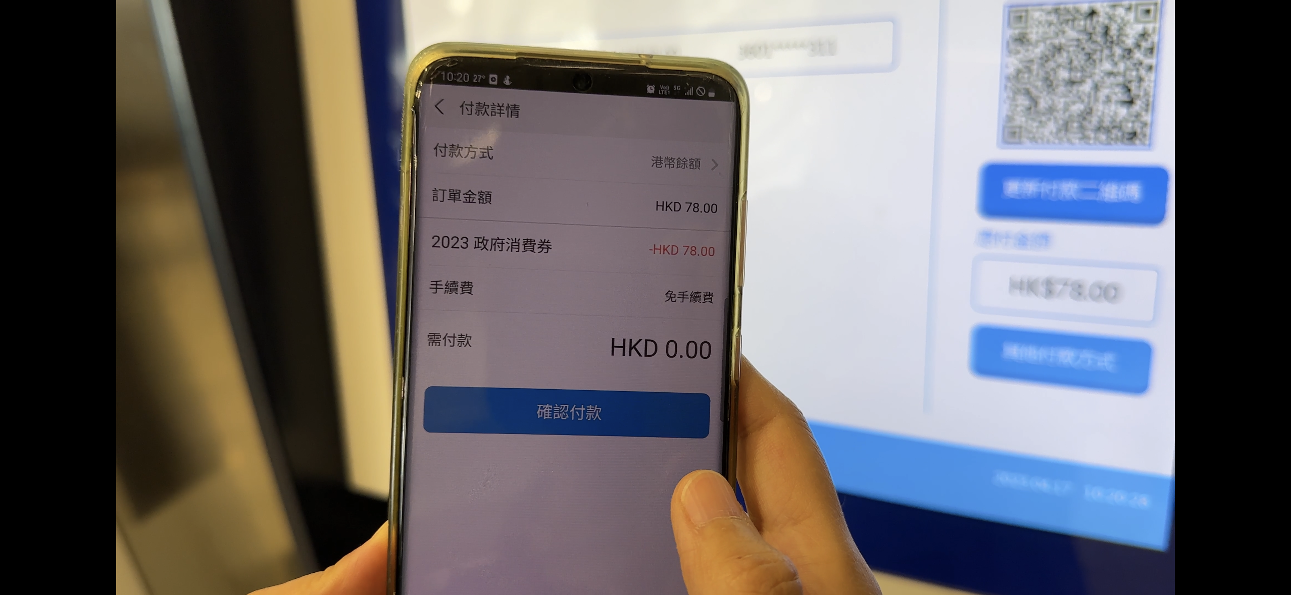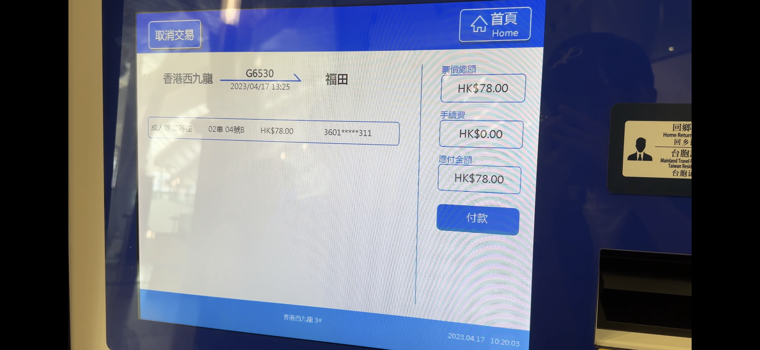 大公文匯全媒體記者今日實測用12306官方APP購買高鐵票,發現支付方式僅支持內地版支付寶及內地版微信。而在高鐵西九龍站售票大廳使用自助購票機,則可以在付款時選擇用AlipayHK,用消費券支付。掃描二維碼(QR code)支付之後,可以使用政府消費券購買到內地的高鐵票。如香港西九龍到深圳福田站的高鐵二等座車票,人民幣68元;如選擇港幣支付,則需要支付78港幣,可以用消費券支付。