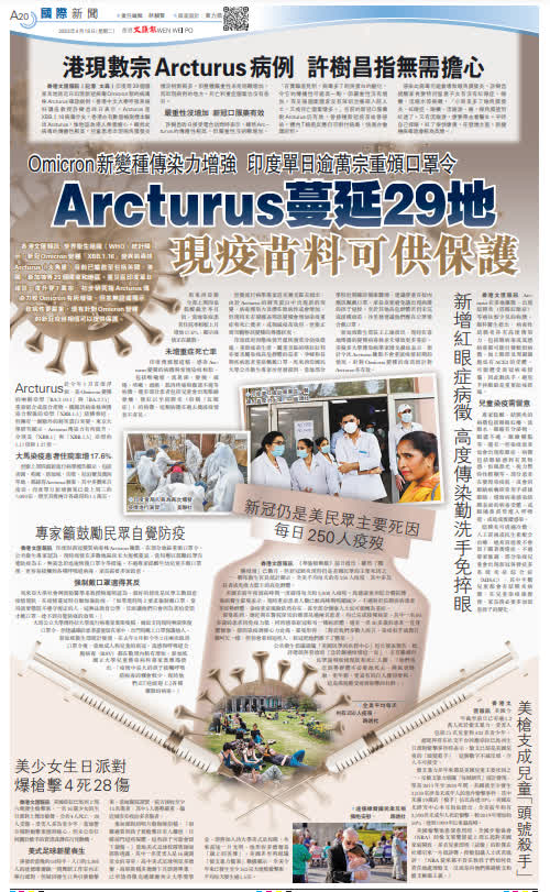 香港文匯報報道,世界衞生組織(WHO)統計顯示,新冠Omicron變種「XBB.1.16」變異病毒株Arcturus(大角星)目前已擴散至包括英國、美國、新加坡等29個國家和地區,重災區印度單日確診一度升穿1萬宗。初步研究指Arcturus傳染力較Omicron有所增強,但並無證據顯示致病性更嚴重,現有針對Omicron變種的新冠疫苗相信可以提供保護。