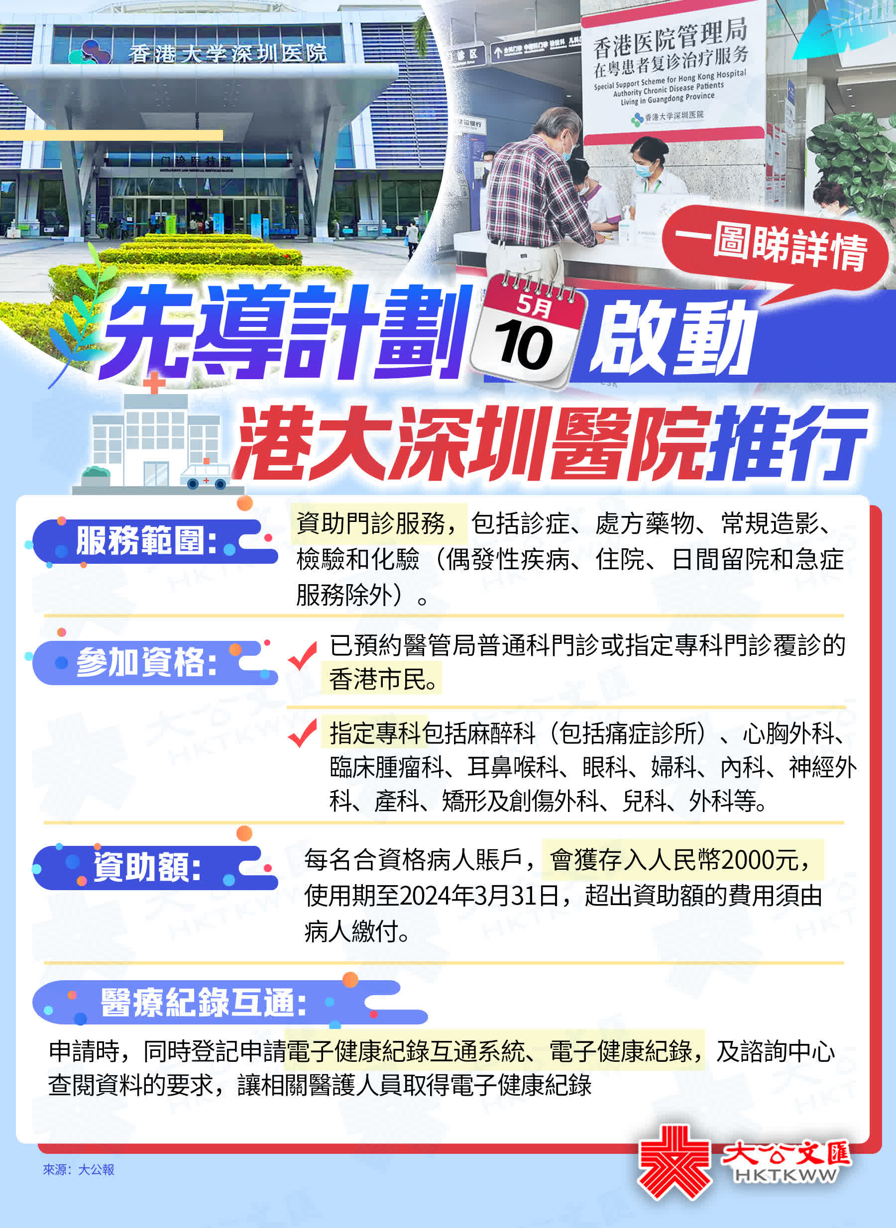 (大公報記者 邵穎)隨着粵港澳大灣區建設不斷推進,愈來愈多港人在大灣區內地城市生活,醫療需求不可忽視。醫務衞生局昨日公布,計劃於5月10日推出「支援粵港澳大灣區醫院管理局病人先導計劃」,讓居住於大灣區內地城市的合資格香港市民,可於香港大學深圳醫院接受資助診症服務,每人可獲2000元人民幣資助額,首階段會運作至明年3月31日。