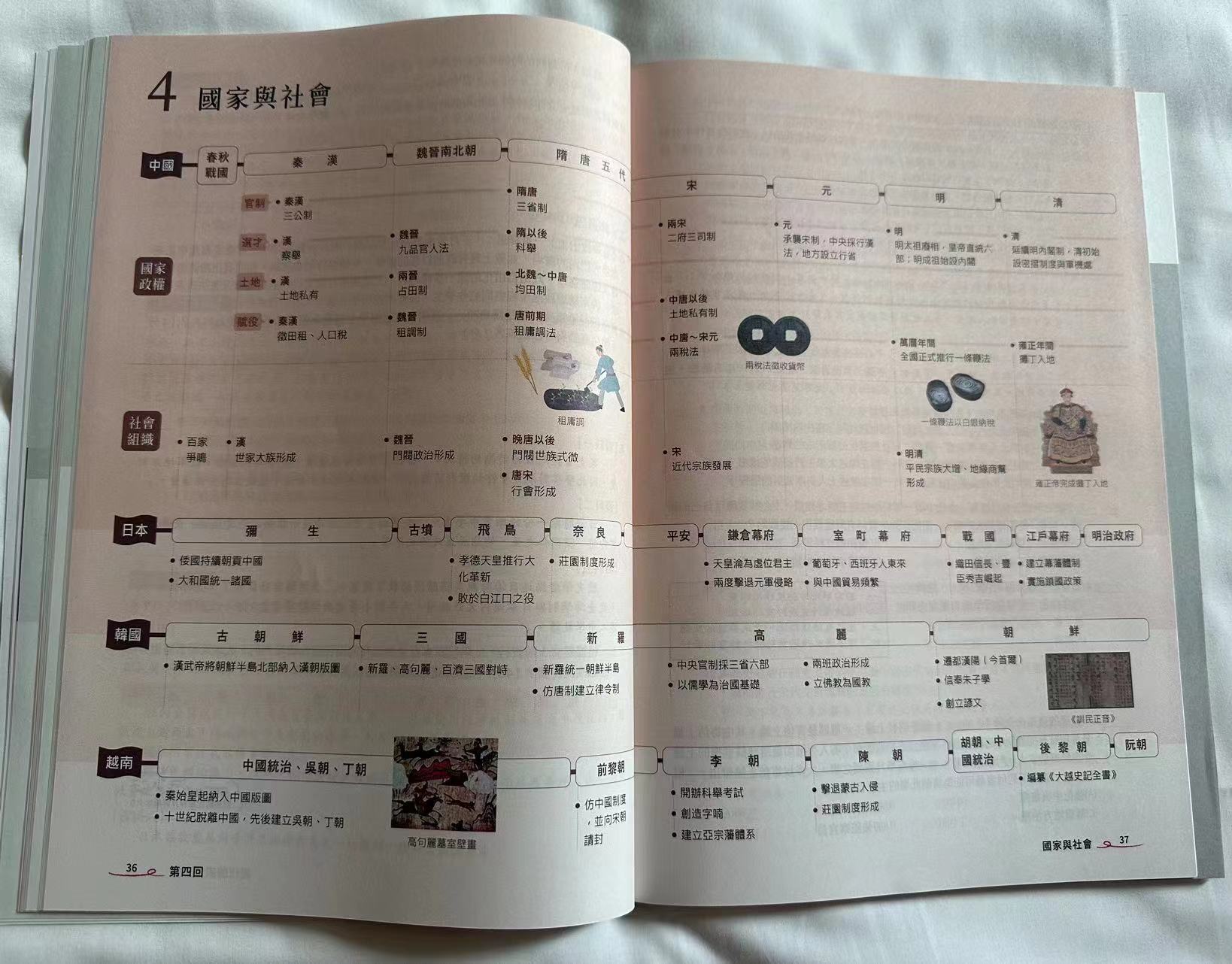 在該書第4部分:國家與社會,筆者終於見到中國的內容,起迄點是秦漢至清朝。然而同一跨頁內,中國是與日本、韓國和越南並列的。
