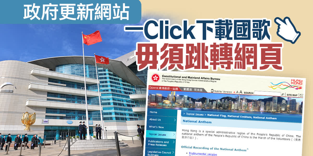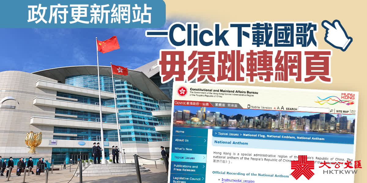 大公文匯全媒體記者報道,香港體育代表隊在參加不同國際比賽時,屢屢發生播錯國歌事件,原因是海外主辦單位按照官方連結下載國歌有困難,因為經常自行在網上搜索,以致被錯誤引導至「港獨」歌曲網頁。政制及內地事務局昨日(17日)終於更新網頁,現時國歌頁面的中、英文版本,均可直接提供國歌檔案供下載,不再連結至中央人民政府網的簡體版面,方便不懂中文人士使用。