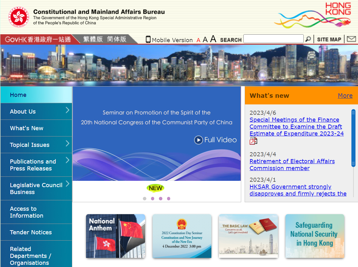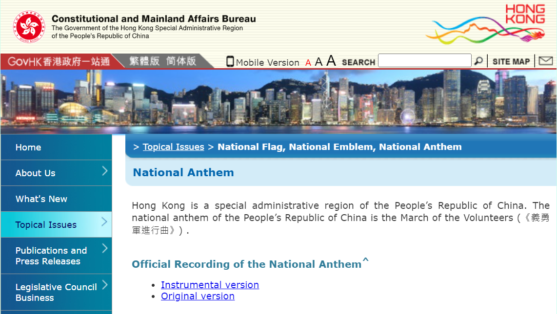 根據舊版的政制及內地事務局的國歌網頁,國歌檔案的連結會開啟中央人民政府網站,語言是簡體中文,轉語言至英文後卻會跳回主頁,要找到下載正確國歌的頁面不容易。更新後,該網頁可直接點擊下載國歌的官方錄音,包括國歌管樂合奏版及國歌齊唱版。另外,國歌的官方視頻,包括mp4及mov兩個格式,亦可直接下載。網頁亦附有詳細的英文版下載檔案說明,圖文並茂詳細介紹國歌下載步驟。