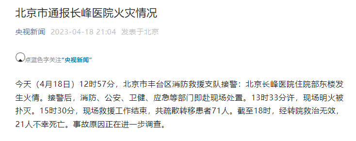 據央視新聞報道,今天(4月18日)12時57分,北京市丰台區消防救援支隊接警:北京長峰醫院住院部東樓發生火情。接警後,消防、公安、衞健、應急等部門即赴現場處置。13時33分許,現場明火被撲滅。15時30分,現場救援工作結束,共疏散轉移患者71人。截至18時,經轉院救治無效,21人不幸死亡。事故原因正在進一步調查。