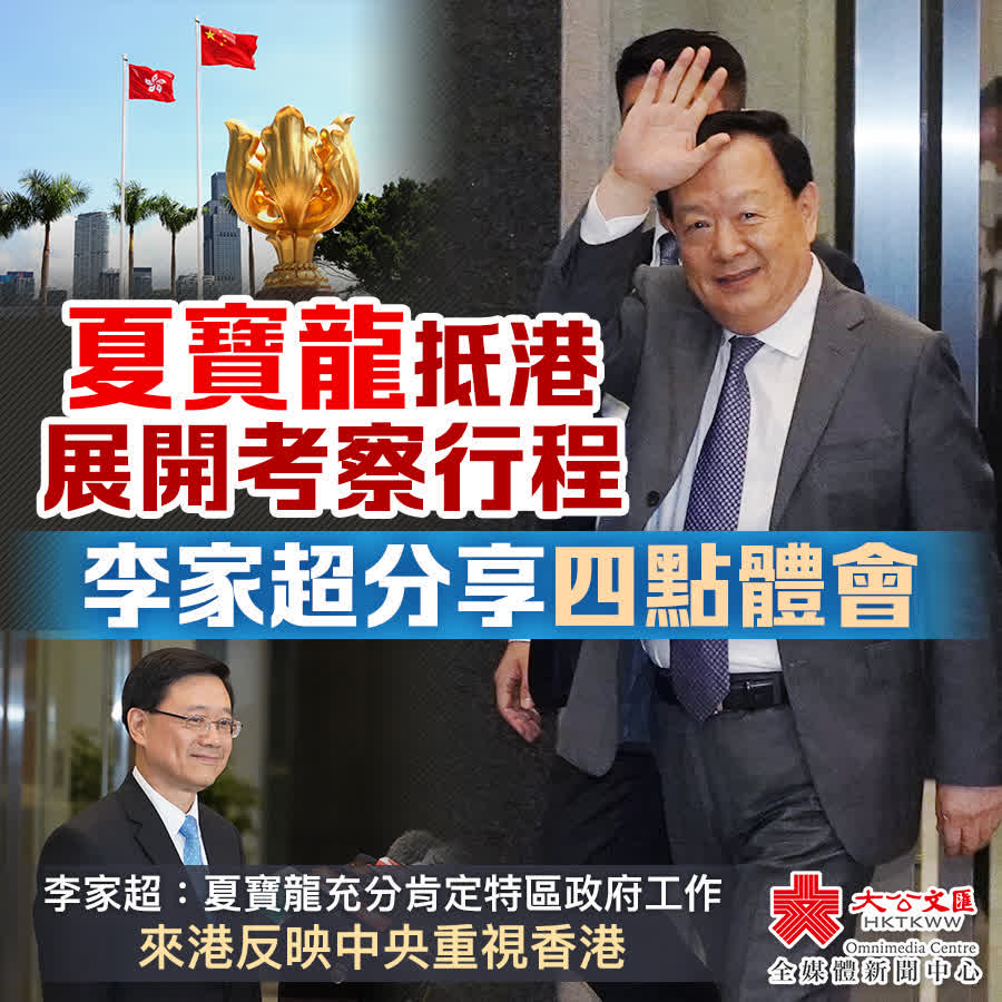 李家超表示,夏寶龍的考察行程多元、廣泛、緊湊,當中包括出席全民國家安全教育日作主旨講話、同社會不同界別人士會面及交流,如行政、立法、司法機構,人大代表、政協委員、社會代表,金融、科技、教育界人士等等。同時,夏寶龍到多區實地考察,包括沙頭角、烏蛟騰、香港科學園、香港交易所,兩間大學、一間中學、一間小學,以及到展城館考察北部都會區和交椅洲人工島兩個大型發展規劃。