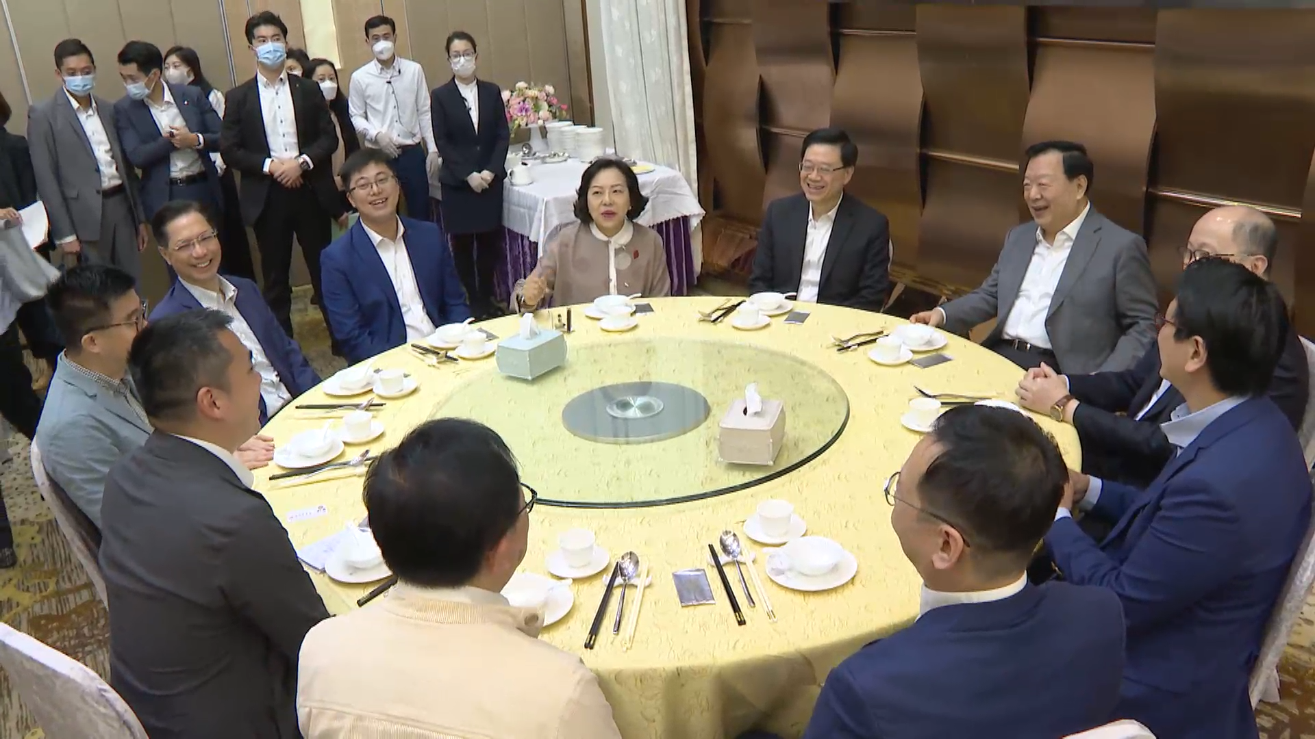 早上,夏寶龍到九龍灣一間酒樓品嘗港式早茶,在行政長官李家超陪同下,與8名區內議員、地區關愛隊、地區「三會」代表一起交流。有在場飲茶的市民表示,夏寶龍主任向所有人揮手及問候大家,感覺很親切。