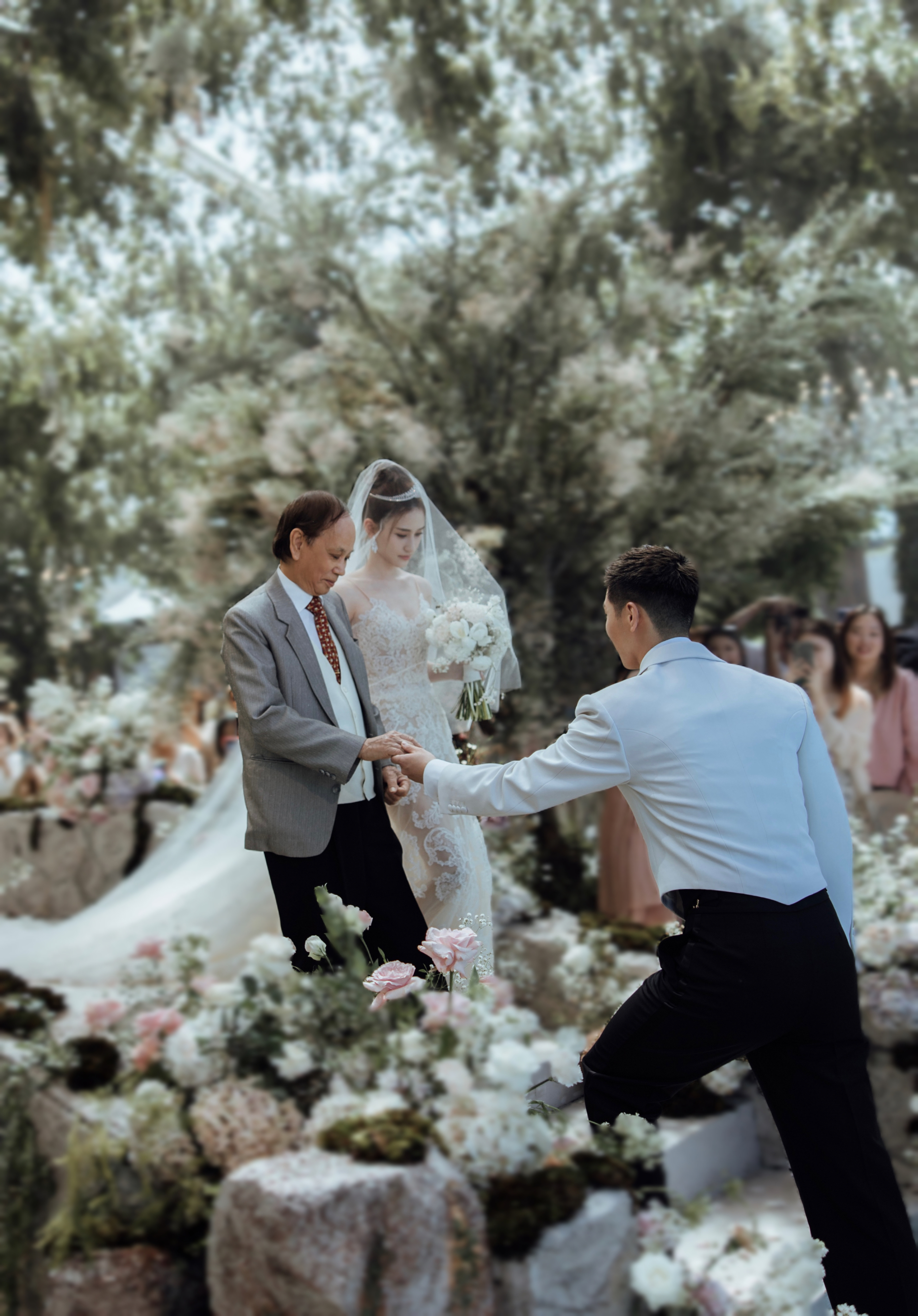 為了打造一個難忘的婚禮,竇驍親自參與整個籌備過程,從場地選址、設計主題、內容構思到音樂選取等細節都相當保密,務求讓他腦海中構思的每個畫面,皆以最完美的方式呈現於現實當中。婚禮儀式現場及晚宴場地搭建了玻璃天幕,草地周圍種滿一棵棵綠色大樹,上方亦垂吊了過百束綠色植物,以白色及粉紅色鮮花作點綴;當陽光穿透樹冠,灑下斑斕的光影,整個環境瀰漫着童話般的浪漫氛圍和神秘色彩,營造出一個隱秘且高貴的夢幻莊園。場地中央的水池上築起了一道橋,高雅的蓮花在池中綻放,讓超「蓮」的名字融入布置之中,盡顯心思。這道橋不僅是場地的一部分,更是整個婚禮的一個重要元素,象徵他們穿越人生的每一個階段,攜手走向美好的未來。