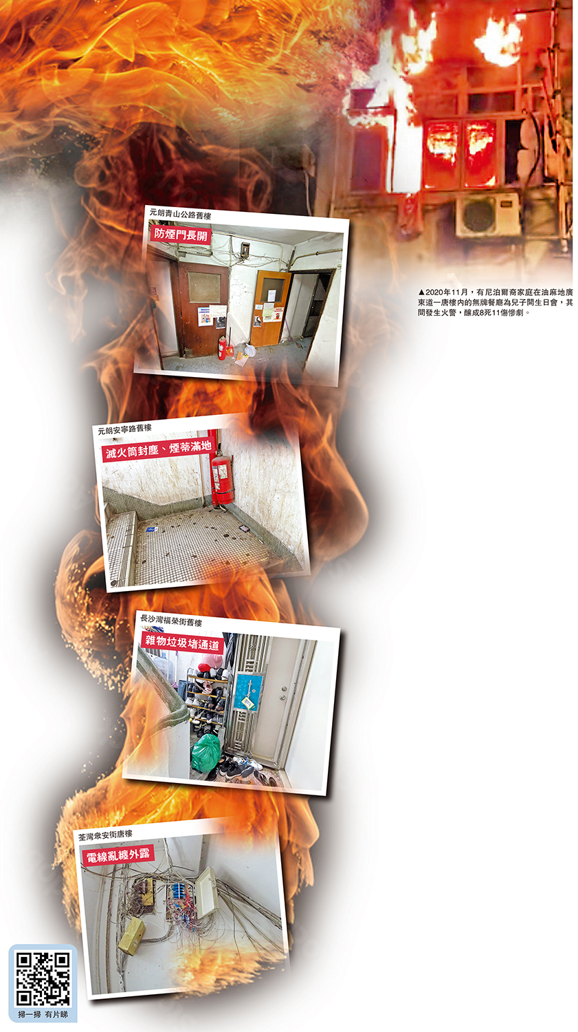(大公報記者 余風、黃山、蘇荣)舊式工廈火警隱患處處,舊住宅樓宇「惹火」程度有過之而無不及。本港樓齡達50年或以上的私人樓宇數目過去10年急增逾兩倍,該類舊樓火警頻生,上月最少有兩宗火災涉及舊樓,一名男戶主不幸失去寶貴性命;2020年油麻地一幢「三無」唐樓大火,無情地奪去8條人命。大公報記者近日巡查多區舊樓,發現走火通道被大型雜物及垃圾堵塞,滿地煙蒂,火災隨時一觸即發;再加上防煙門長開、天台的通道阻塞,恐怕逃生無門。