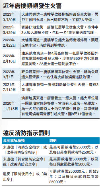 《消防安全(建築物)條例》在2007年生效,規定全港約14000幢在1987年或之前落成的綜合用途及住用建築物提升至切合現代要求的防火保障。消防處及屋宇署會進行巡查、向業主或佔用人發出「消防安全指示」,指明須進行的消防安全改善工程。截至今年2月底,消防處已完成巡查約10539幢目標樓宇,並已向9917幢目標樓宇發出共超過263700張相關指示,而已獲遵辦或撤銷的指示(即不用跟進的指示)約有101500張,即仍有約六成相關指示有待遵辦或跟進。