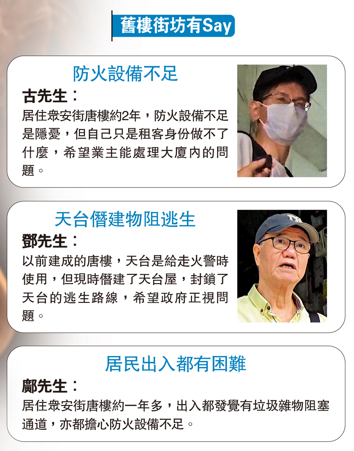 此外,長沙灣福榮街有多幢唐樓的梯間都被放置雜物,阻塞往天台的逃生通道,而天台一樣堆放雜物,當中包括石油氣罐卻無人清理。大埔區內的舊大廈同樣是重災區,懷仁街的一幢舊樓大部分防火門都保持打開,梯間更有大型傢俬阻塞,上址的滅火筒亦明顯遭棄用,貼紙上的日期都已褪色;寶鄉街另一幢舊樓外牆不但十分殘舊,記者從外已能看見大部分樓層的走廊位都放着雜物。