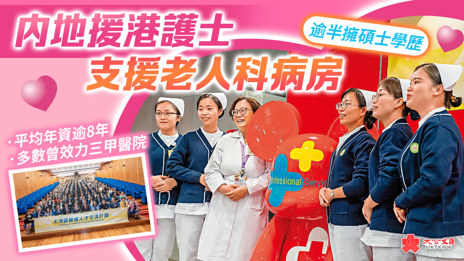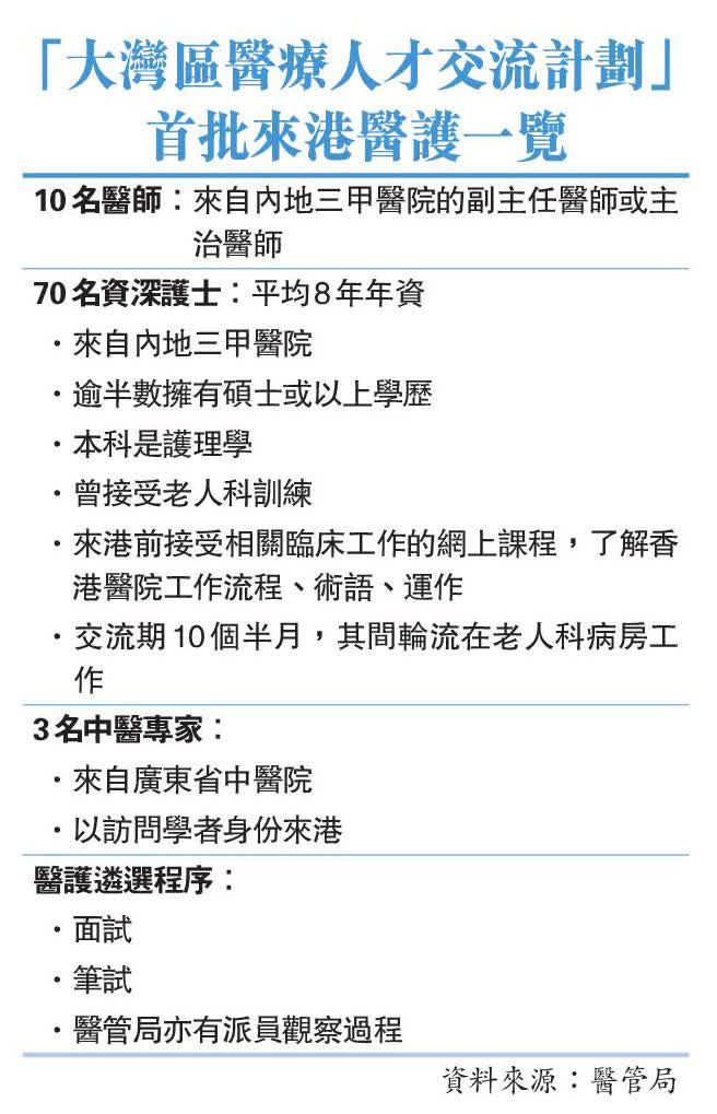 (香港文匯報 記者 文森、費小燁)醫管局「大灣區醫療人才交流計劃」首批共83名內地醫護日前陸續抵港,包括70位廣東省資深護士、10位內地醫生和3位中醫專家。未來十個半月至一年,他們會在港進行專業交流。醫管局護理部高級行政經理梁明昨日透露,該批內地護士平均年資達8年或以上,逾半擁有碩士或以上學歷,大部分曾在內地三甲醫院工作,專長是老人科,屬高質素的護士,將輪流分配到七個醫院聯網的老人科病房工作,有助紓緩醫管局缺乏人手的問題,加深了解兩地臨床治療。他又透露,最快年底會再有百名醫護來港交流。