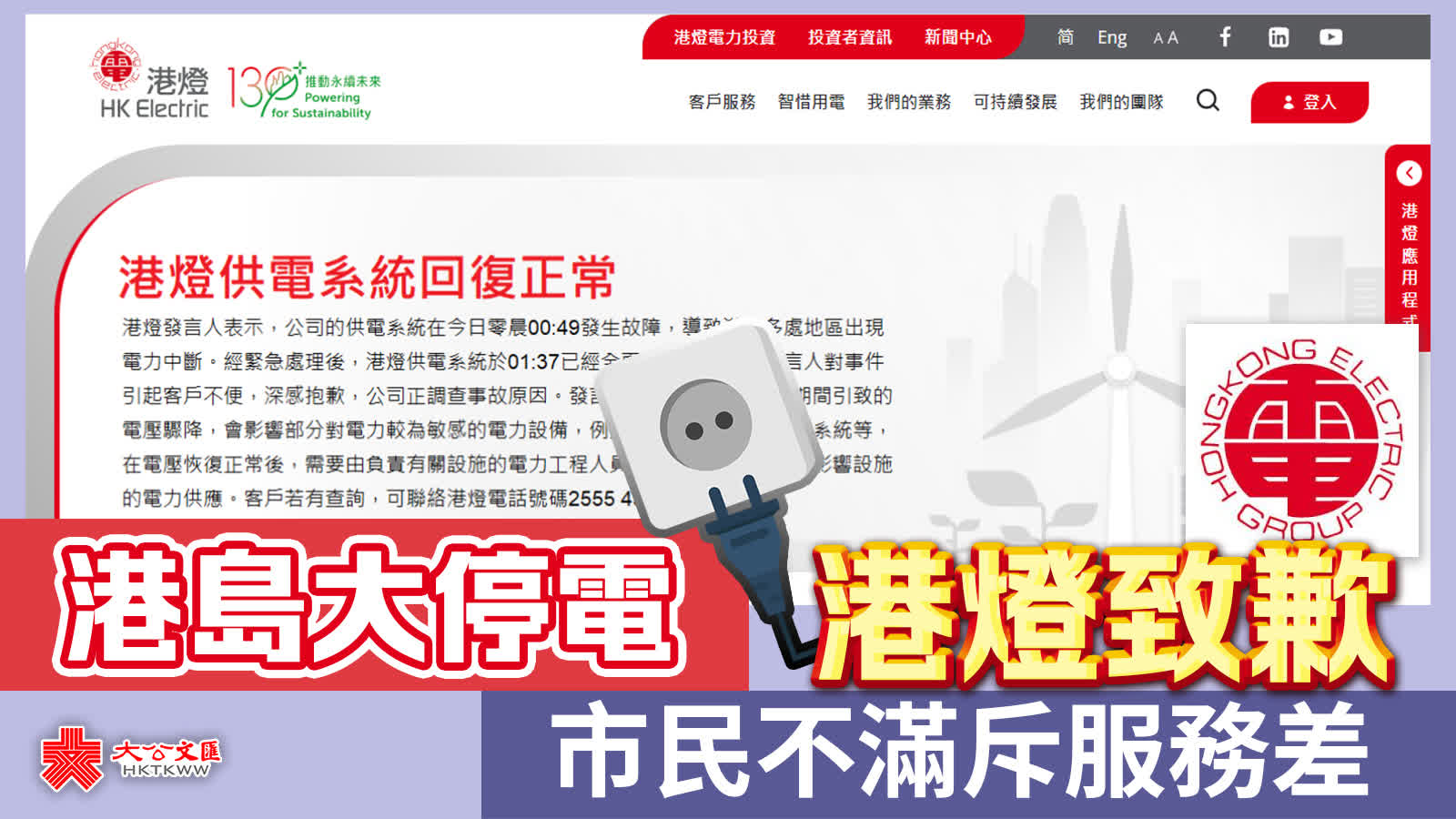 大公文匯全媒體報道,港島部分地區今日(19日)凌晨發生電壓驟降導致停電,發生多宗被困升降機及火警鐘鳴響事故。港燈發言人表示,供電系統在今日0時49發生故障,導致港島多處地區出現電力中斷。經緊急處理後,已於凌晨1時37分全面恢復正常。公司正在調查事故原因,對事件引起客戶不便,深感抱歉。