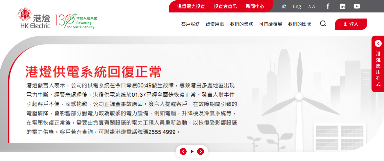 發言人提醒客戶,在故障期間引致的電壓驟降,會影響部分對電力較為敏感的電力設備,例如電腦,升降機及冷氣系統等,在電壓恢復正常後,需要由負責有關設施的電力工程人員重新啟動,以恢復受影響設施的電力供應。