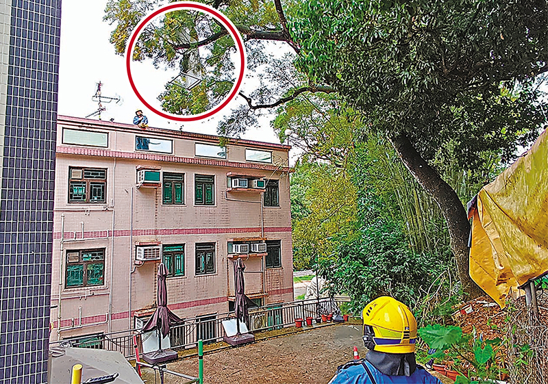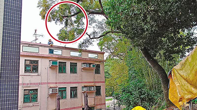 約同一時間,西貢西沙公路大洞禾寮村一張放在村屋天台、約4呎長摺枱被強烈陣風捲起,吹上附近一棵高約10米大樹杈上搖搖欲墜,要由消防員到場移除。