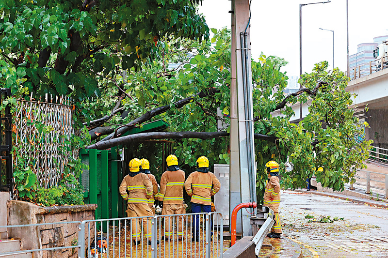 在狂風暴雨下,多區發生塌樹意外。消防處僅於上午11時至11時半的半個小時內,已接獲至少14宗塌樹報告出動處理。在大埔仁興街,一棵約13米高大樹於上午約11時10分倒塌,壓中旁邊建築物,有外牆喉管和冷氣機組件損毀,無人受傷。