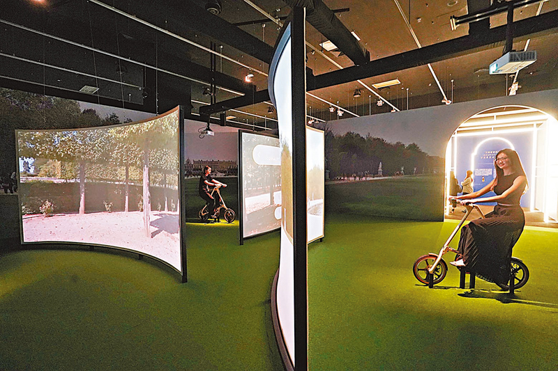 同時,在「凡爾賽宮之自然景觀」展區會以自行車互動裝置,帶觀眾漫遊於凡爾賽宮的王家園林之間,欣賞法式花園、特里亞農宮花園和王后小莊園等,現場共設有3輛自行車及3面弧形大屏幕,觀眾可點選想去的庭院,並自由控制騎行速度。鄧民亮表示,透過這一系列創新的互動裝置,可讓觀眾細賞凡爾賽宮的建築工藝和豐富宮廷的收藏。