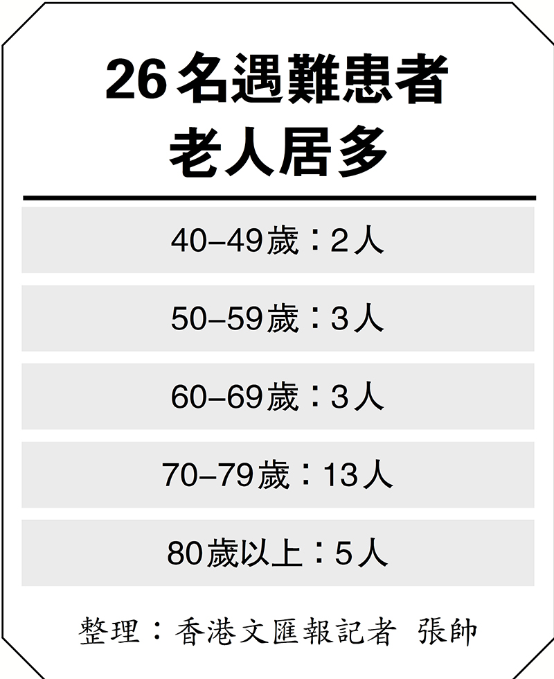 根據通報,截至19日9時,事故已導致29人遇難,男性13人、女性16人,其中26人為住院患者,另有一名護士、一名護工和一名家屬。在死亡人員中,26名長峰醫院住院患者平均年齡71.2歲,最小40歲,最大88歲(見表)。轉院後在院治療39名傷病員,危重3人、重症18人、病情平穩18人。