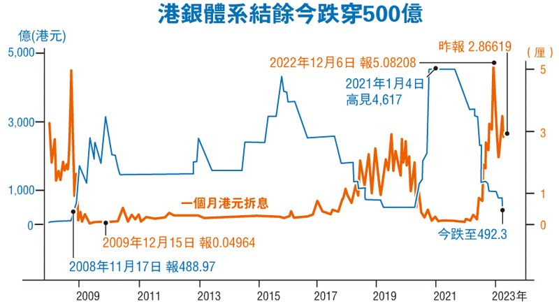 港銀體系結餘由在2021年曾高見逾4,600億元,至今大減近九成,現時資金流走主要受累港美息差擴闊,市場套戥交易誘因增加下,資金湧向高息的美元。而美國下月議息在即,市場大多預期美國將再加息0.25厘,港元一個月拆息昨升至2.86619厘,不過比起美元1個月LIBOR為4.95271厘,港美息差仍有逾2厘差距。