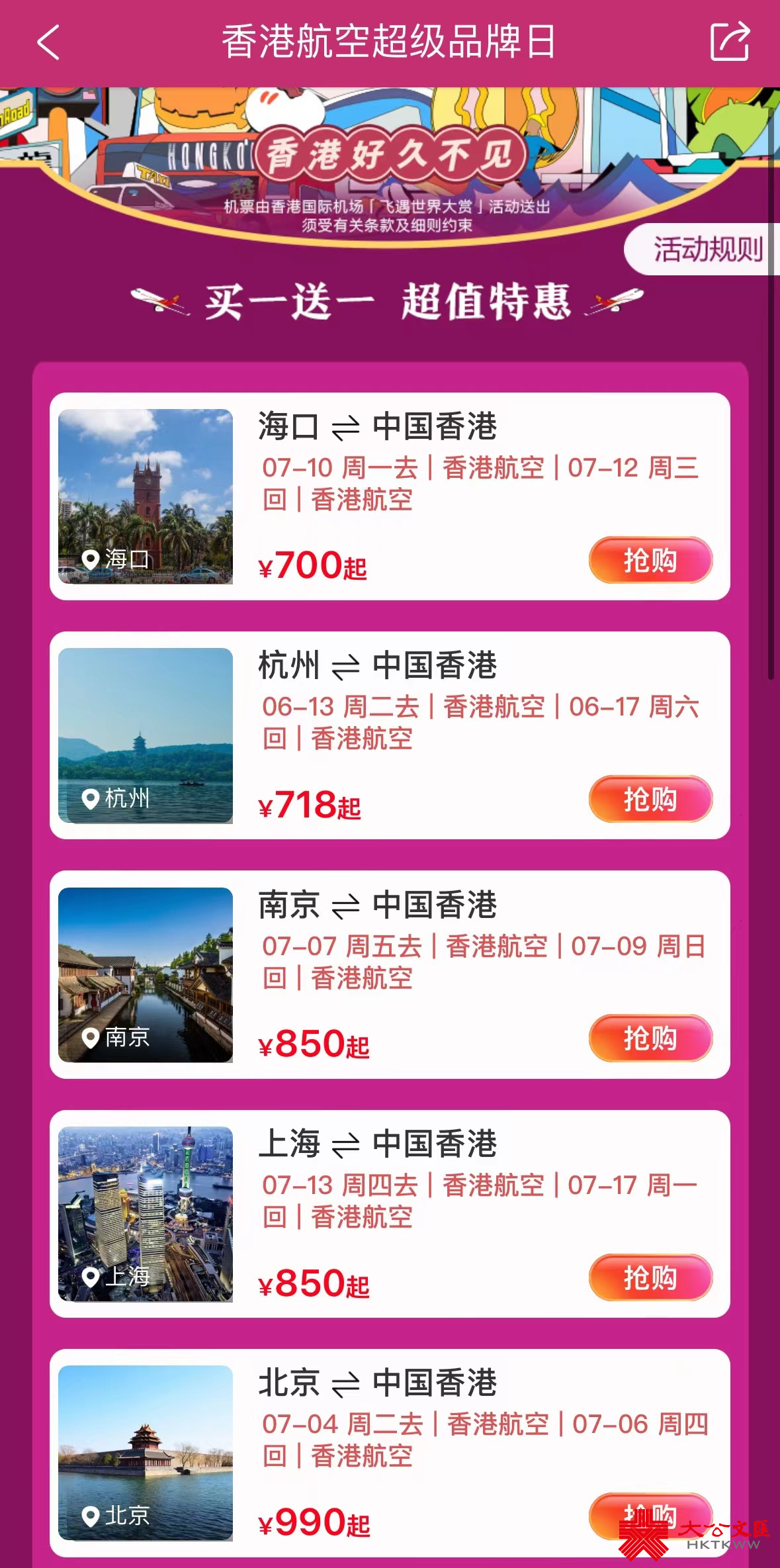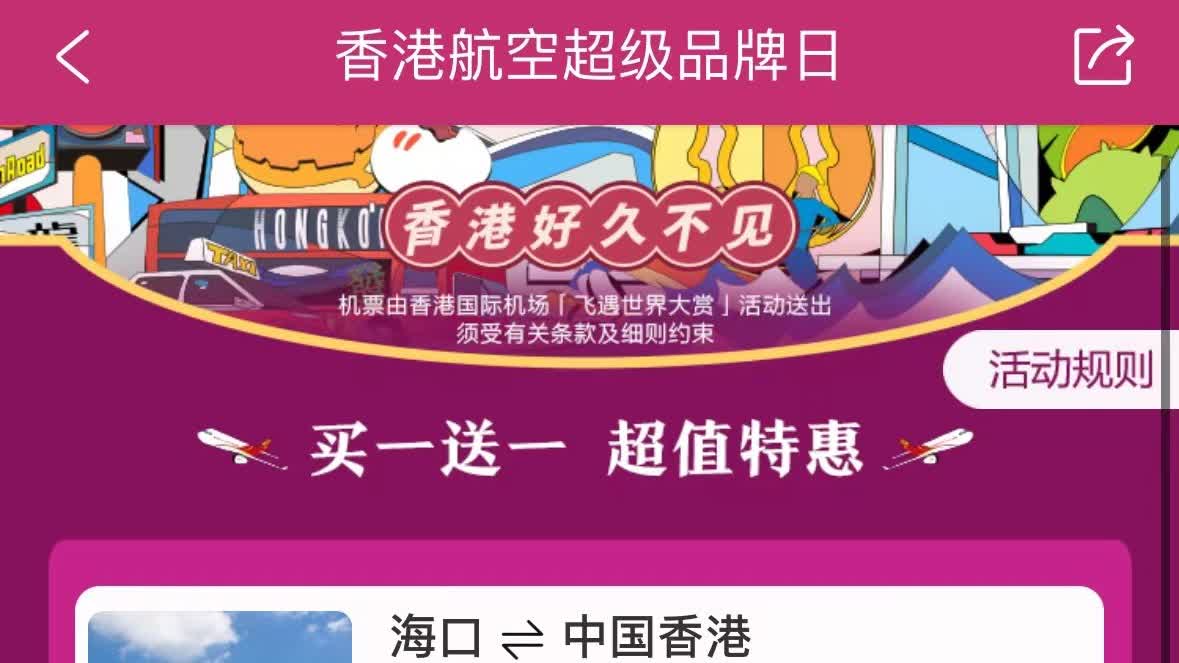 大公文匯全媒體報道,香港航空推出「買一送一」活動,4月17日至4月20日期間,用戶可在攜程APP機票頁面搜索由上海/北京/杭州/南京/海口往返香港的航班,並選定含有「二人同行買一送一」字樣的票價點擊預訂,便可享受「一人價錢,兩人飛」活動。活動今日(20日)最後一日在攜程平台發售優惠機票,想要來港遊玩的旅客,就要抓緊機會搶票喇!